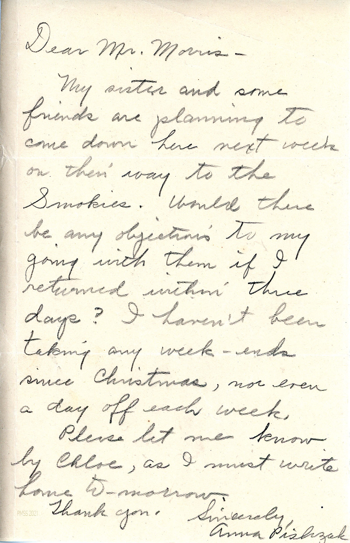 [008] N.D. To Morris from Pishzak, asking leave for three days to join her sister and friend to the Smoky Mountains.