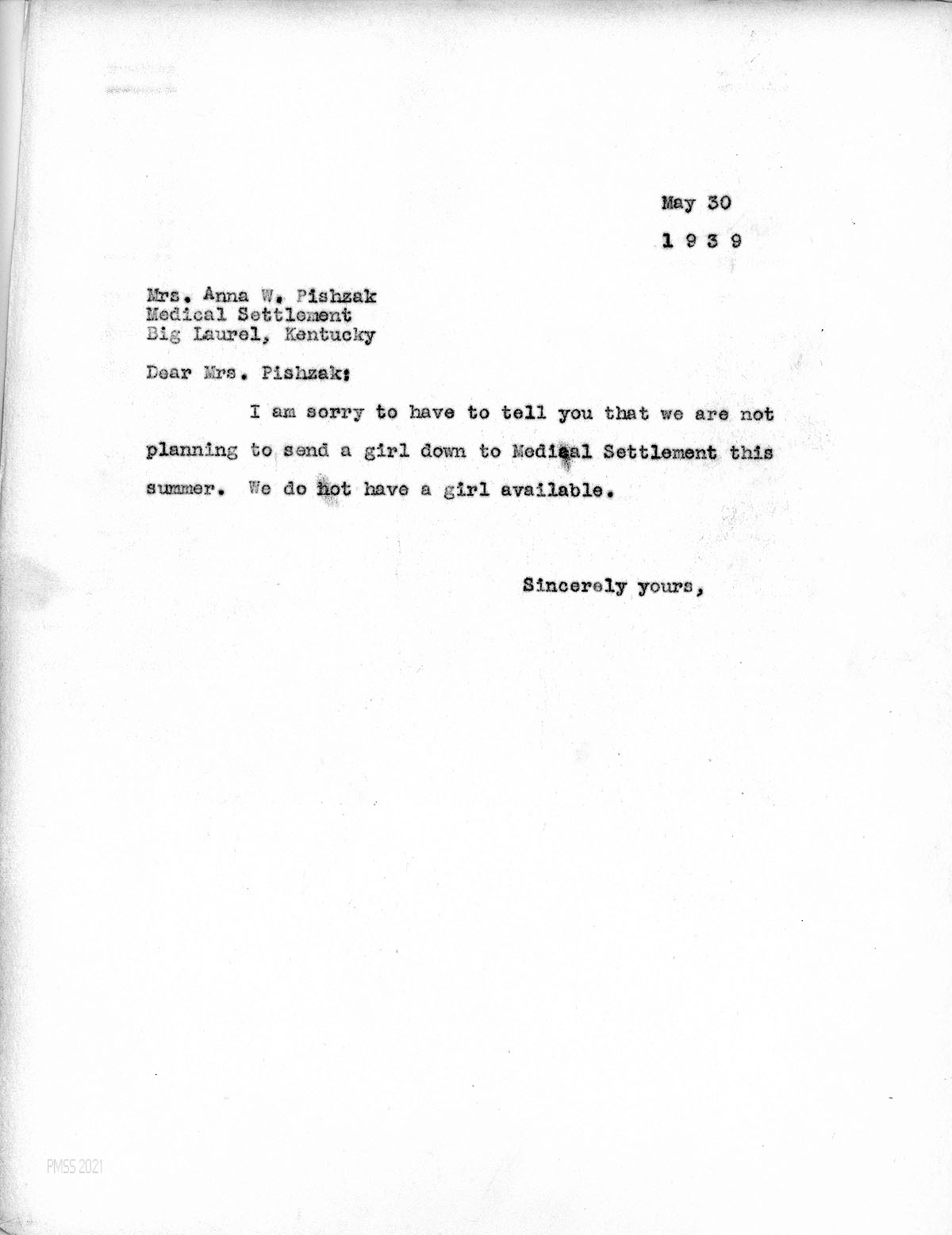 [010] May 30, 1939. To Pishzak from [unsigned]. There are no girls available to send to M.S. this summer.