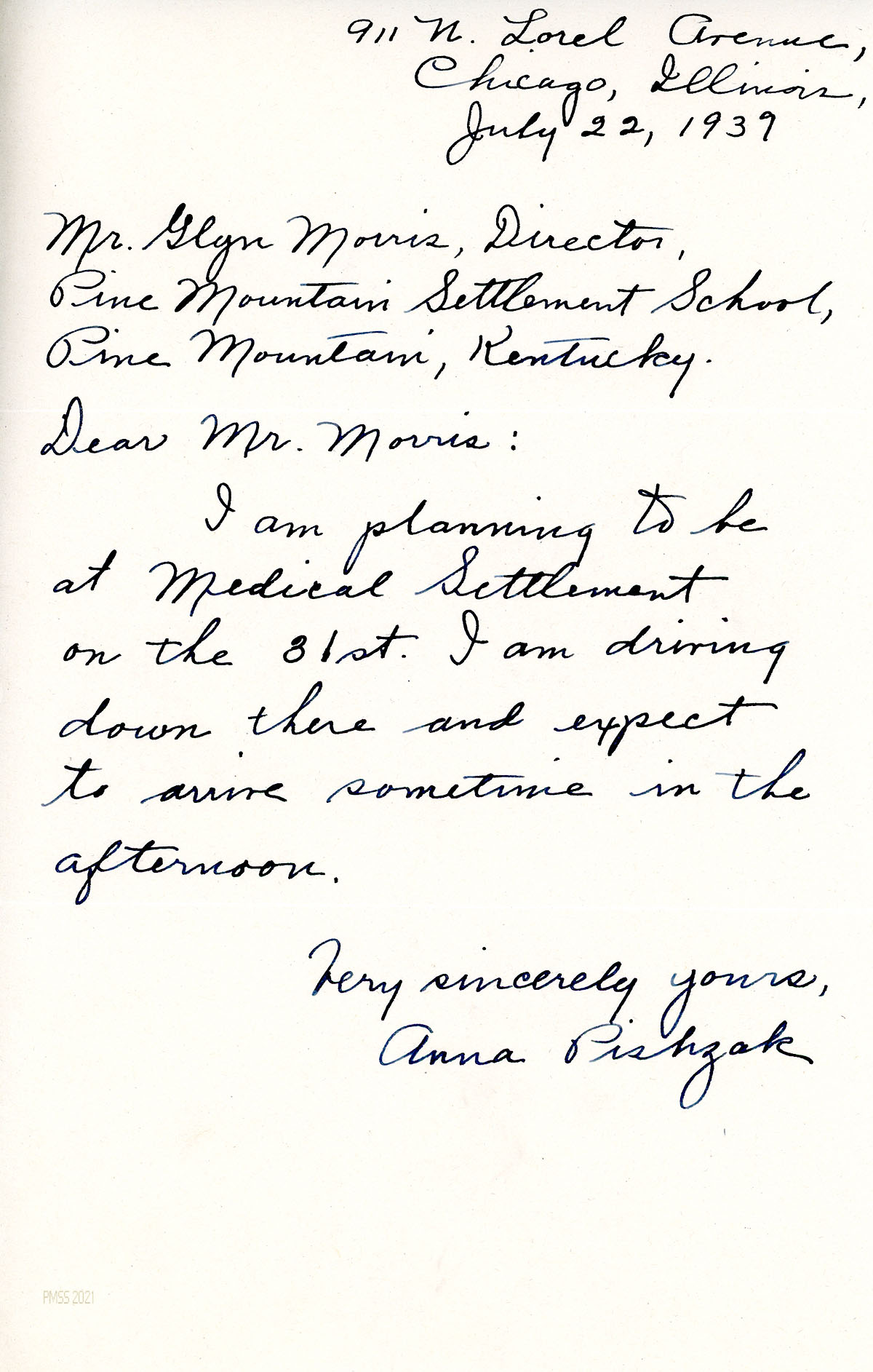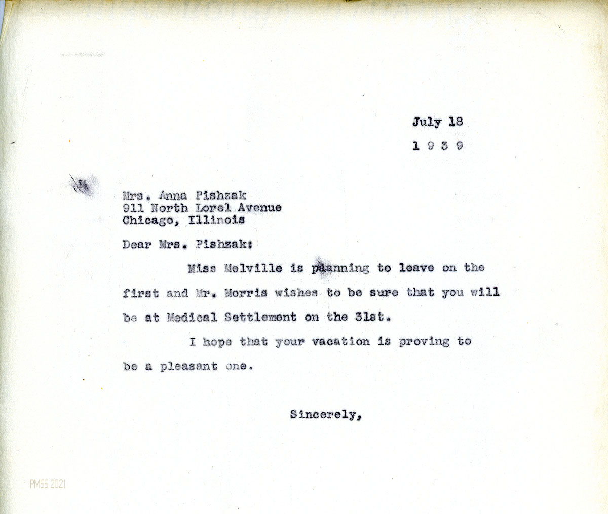 [032] August 4, 1941. To Pishzak in Chicago from [unsigned], assuring that work at M.S. is “going nicely. … I hope …that some inspiration will come forth about further use of Medical Settlement.”