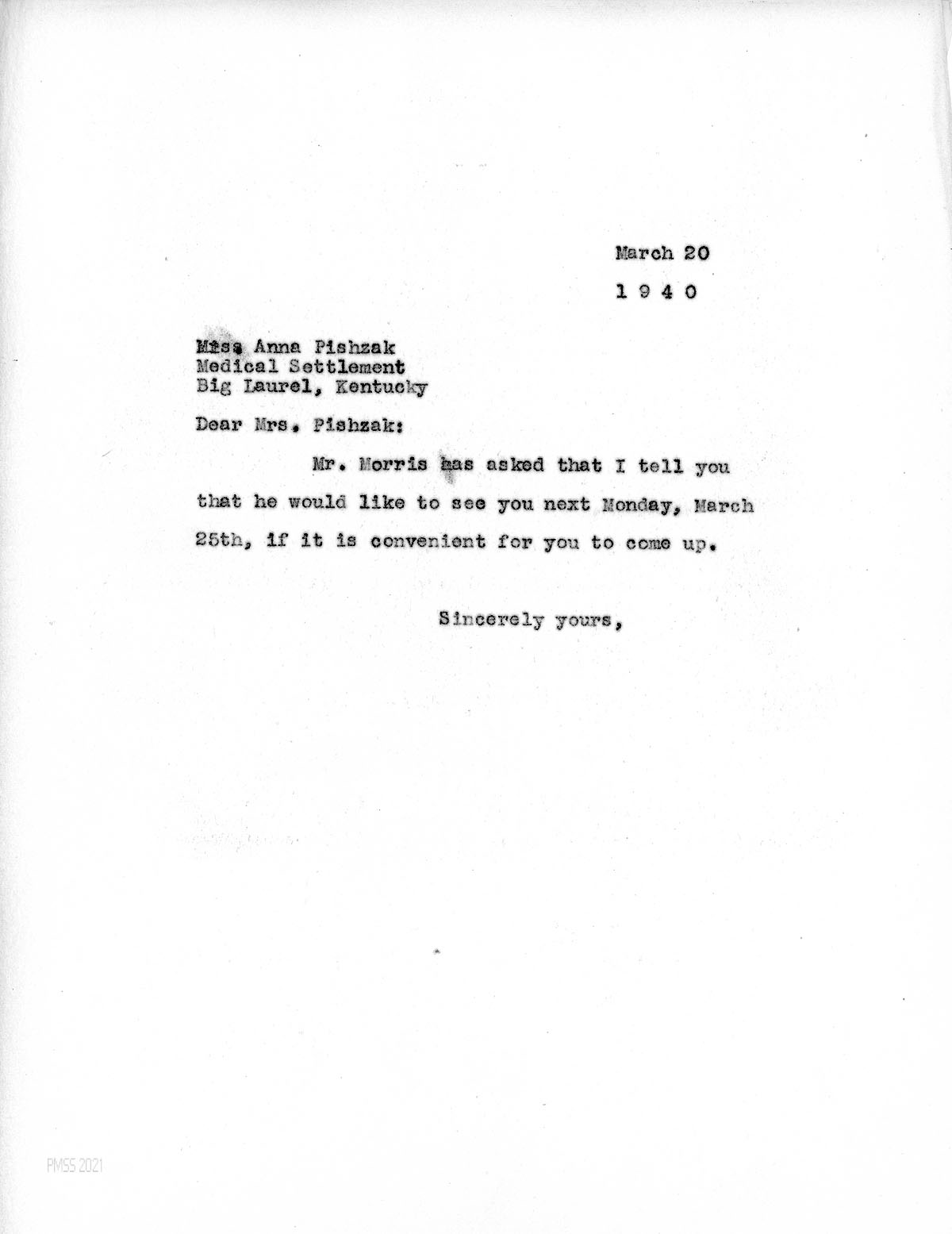[020] April 26, 1940. Typewritten letter to Morris from Pishzak, who encloses her work report; asks for a few days off this winter to join friends on a trip; suggests that Alta and Chad Turner stay with Nancy Boggs in her absence. Ask if PMSS would supply transportation for Big Laurel girls to attend a 4-H club style show in Harlan. Mrs. Perkins is anxious for them to attend, and also Maxine Holbrook and Emma Lou Mullins.