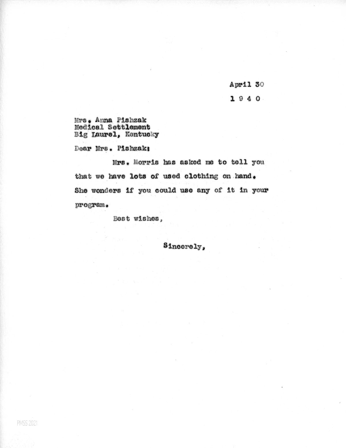 [021] April 30, 1940. To Pishzak from [unsigned]. Mrs. Morris asks if Big Laurel could use any of the used clothing that she has.