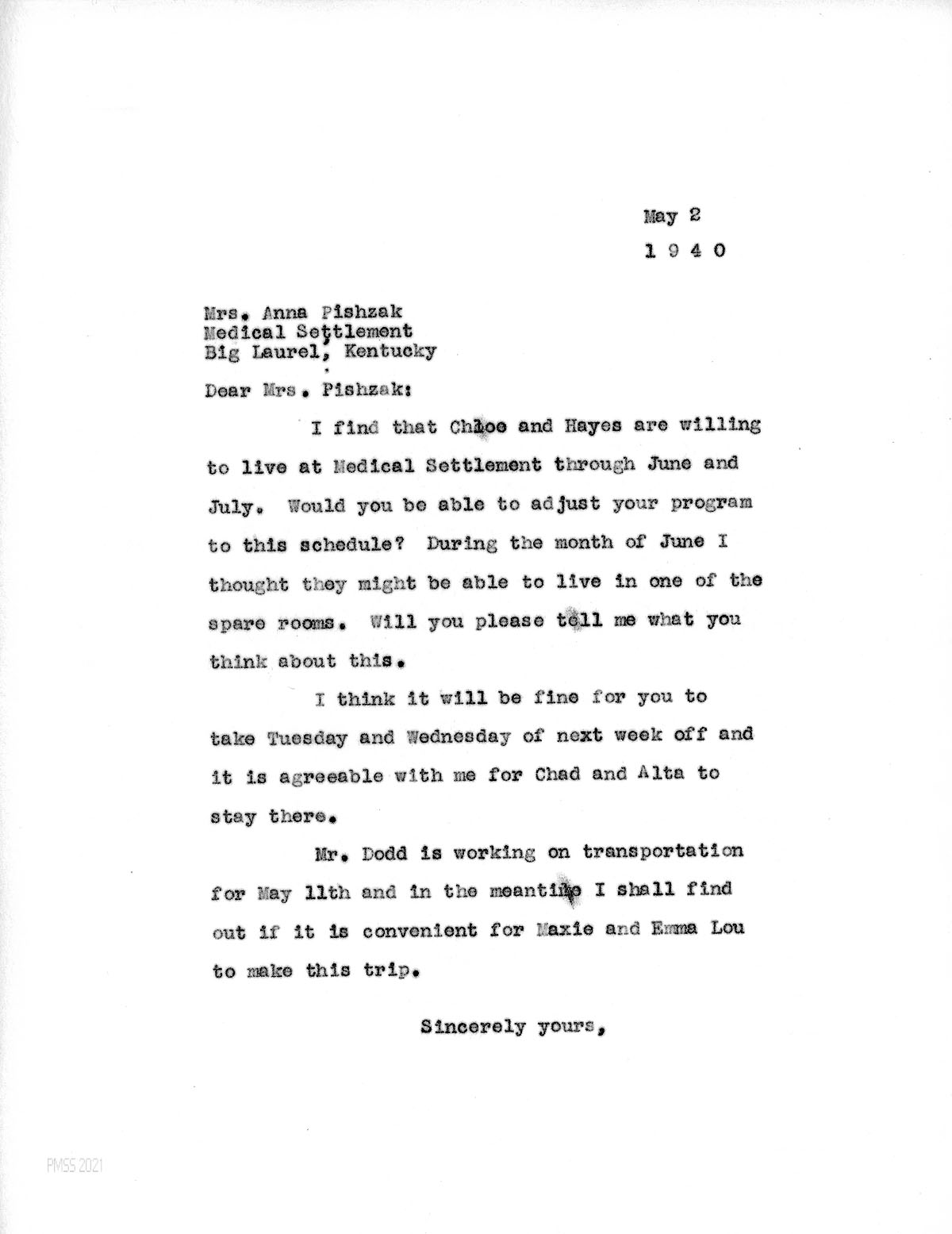 [022] May 2, 1940. To Pishzak from [unsigned]. Asks if Chloe and Hayes can live at M.S. in June and July; agrees to her taking two days off and that Chad and Alta fill in for her; Mr. [Arthur] Dodd is working on transportation for May 11.