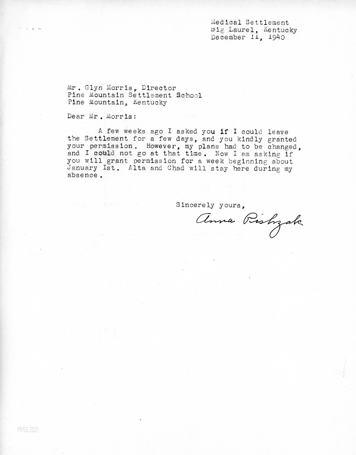 [026] December 11, 1940. Typewritten letter to Morris from Pishzak, asking for a week off beginning January 1.