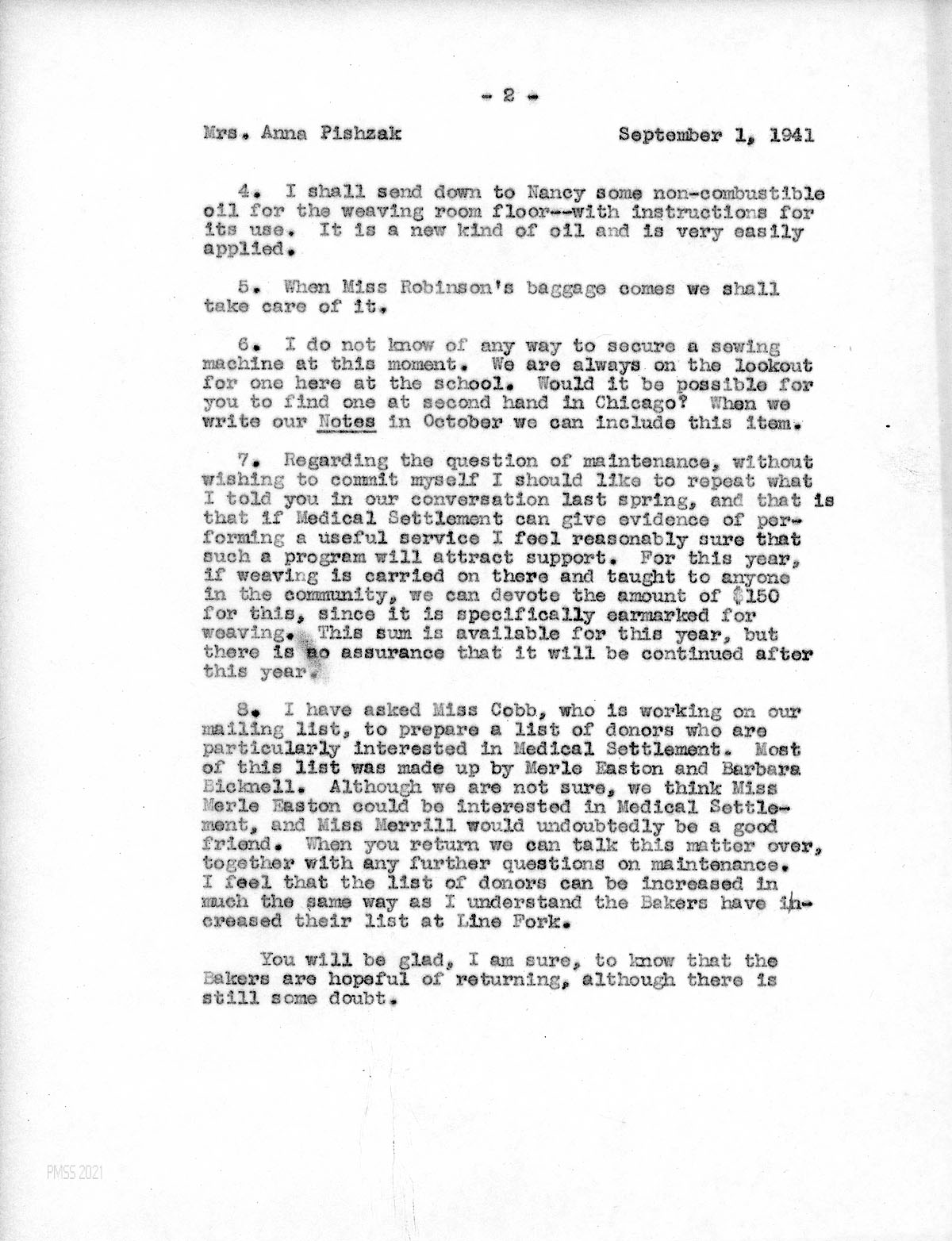 [038] September 29, 1941. MEMORANDUM OF CONVERSATION WITH MRS. PISHZAK: Reaffirmed that “the school is not committed in any way to financial support of Medical Settlement…. We agreed that as soon as Mrs. Pishzak begins to teach weaving, the money appropriated by the Colonial Coverlet Guild for the purpose of helping with a weaving program at Pine Mountain would be turned over to Mrs. Pishzak toward the maintenance of this program at Big Laurel.” Other PMSS agreements concern the coal bin, furnishing 3 looms, and printing “circulars to advertise the weaving program.”