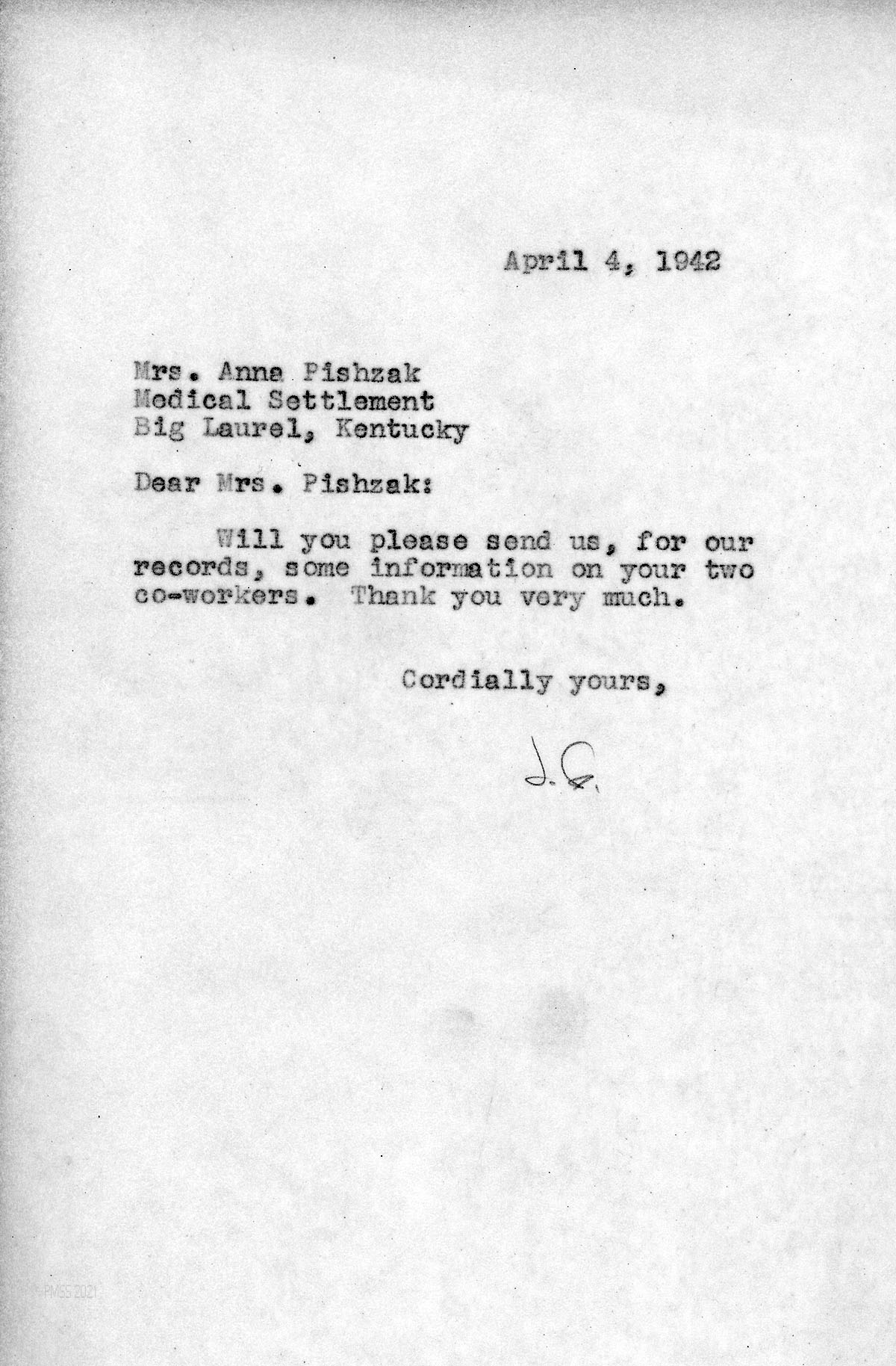 [045] April 4, 1942. To Pishzak from “J.G.”, asking for information about her two co-workers.