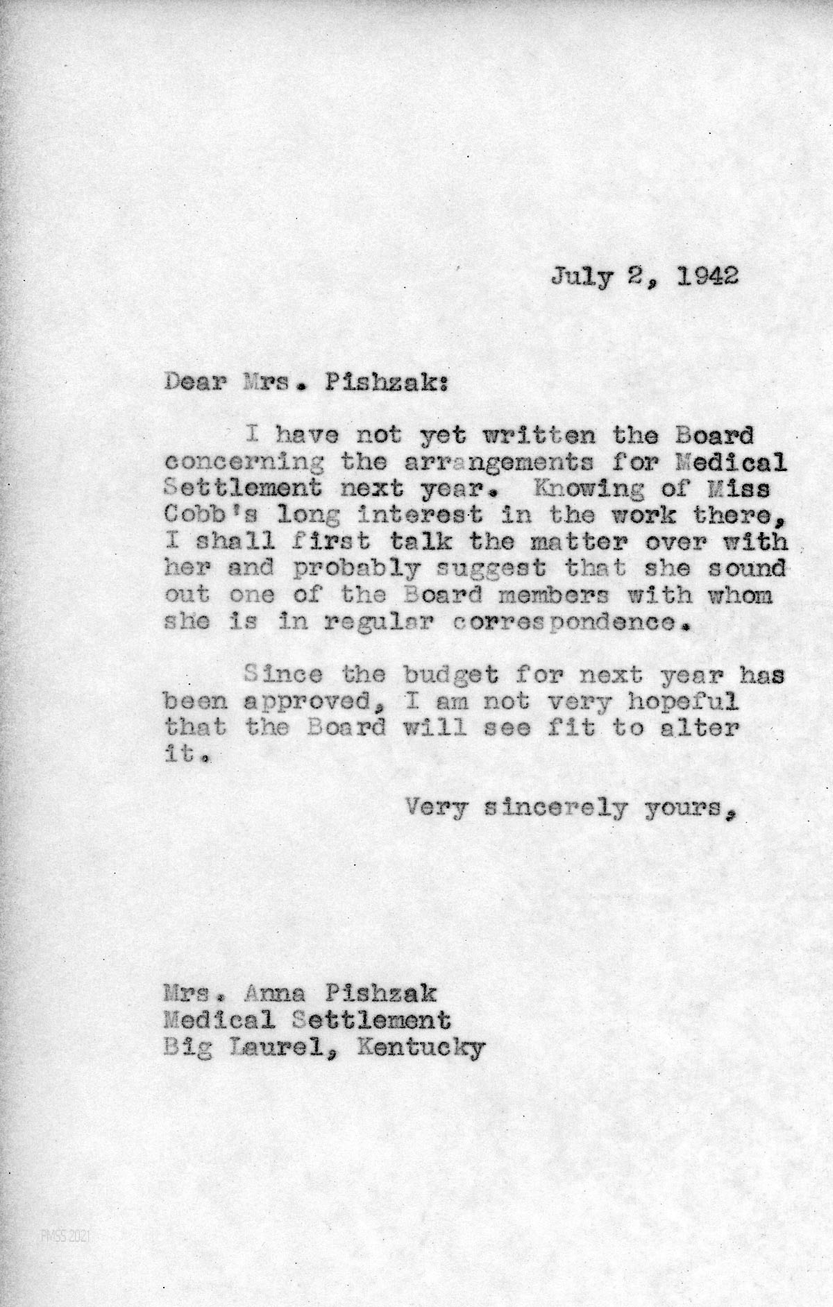 [050] July 2, 1942. To Pishzak from [unsigned], who will be writing the Board “concerning the arrangements for Medical Settlement next year” after talking to Miss [Alice] Cobb first.