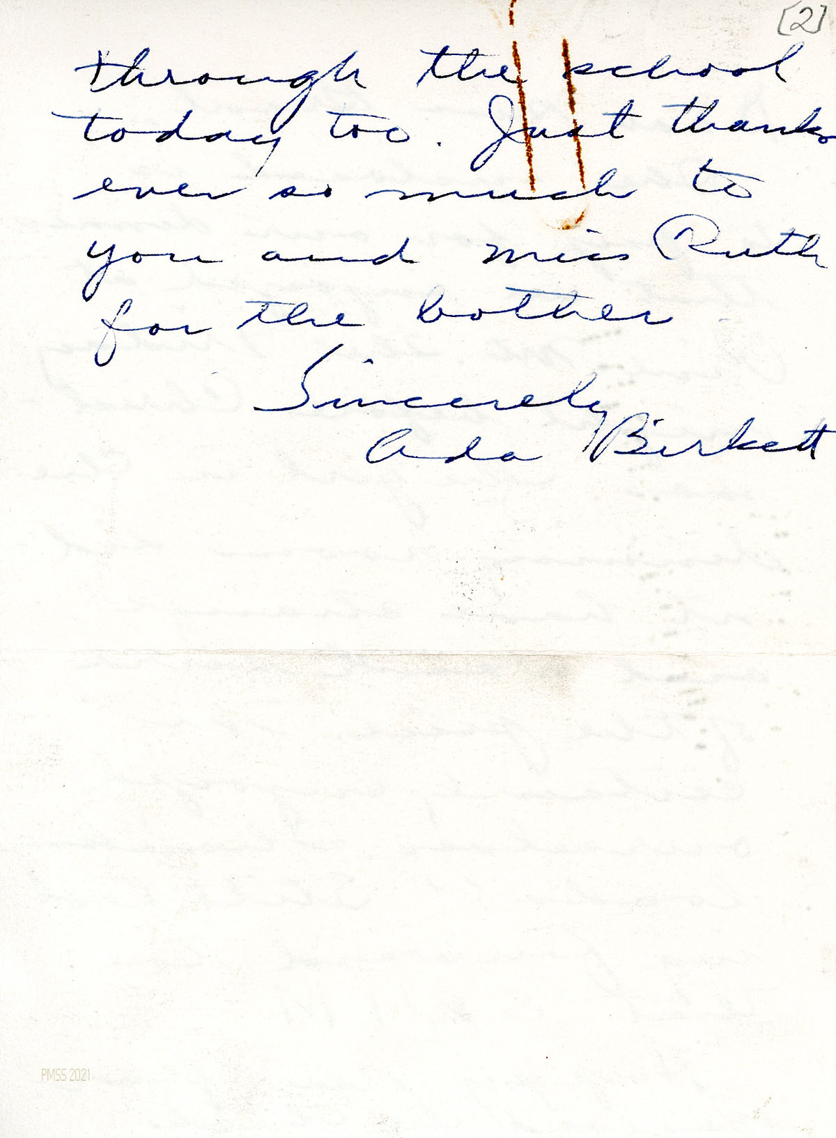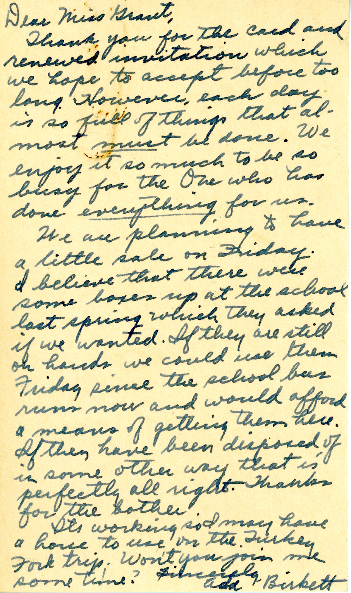 [052a] To Miss Grant from Ada Birkett, thanking her for the invitation; planning a sale and need boxes from PMSS to be sent via the school bus.