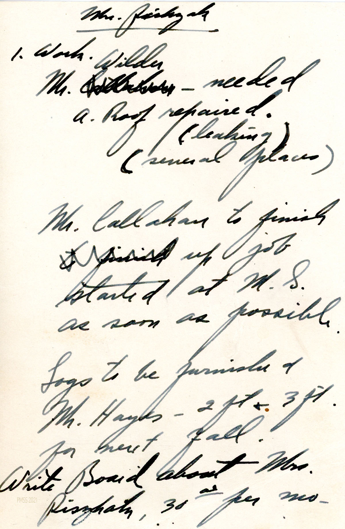[054] N.D. Handwritten notes with “Mrs. Pishzak” at the top, concerning Mr. Wilder needed for roof repair; Mr. [Boone] Callahan to finish job started at M.S.; Mr. [William] Hayes to furnish logs; will write the Board about $30 a month for Mrs. Pishzak.