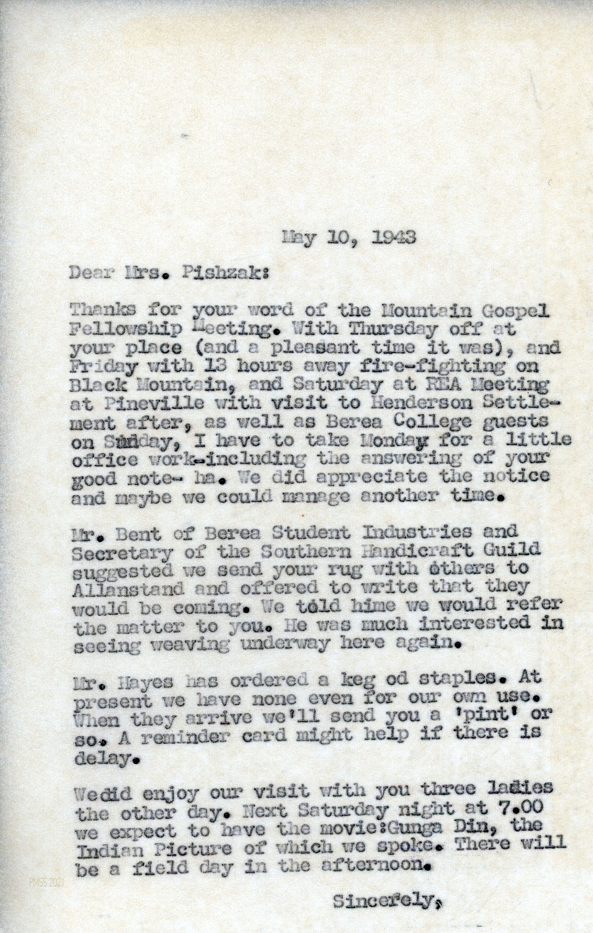 [065] May 10, 1943. To Pishzak from [unsigned]. “Mr. Bent of Berea Student Industries and Secretary of the Southern Handicraft Guild suggested we send your rug with others to Allanstand… He was much interested in seeing weaving underway here again.” Mentions that “Mr. Hayes has ordered a keg of staples” and offered to send a “pint.” The next movie will be Gunga Din.