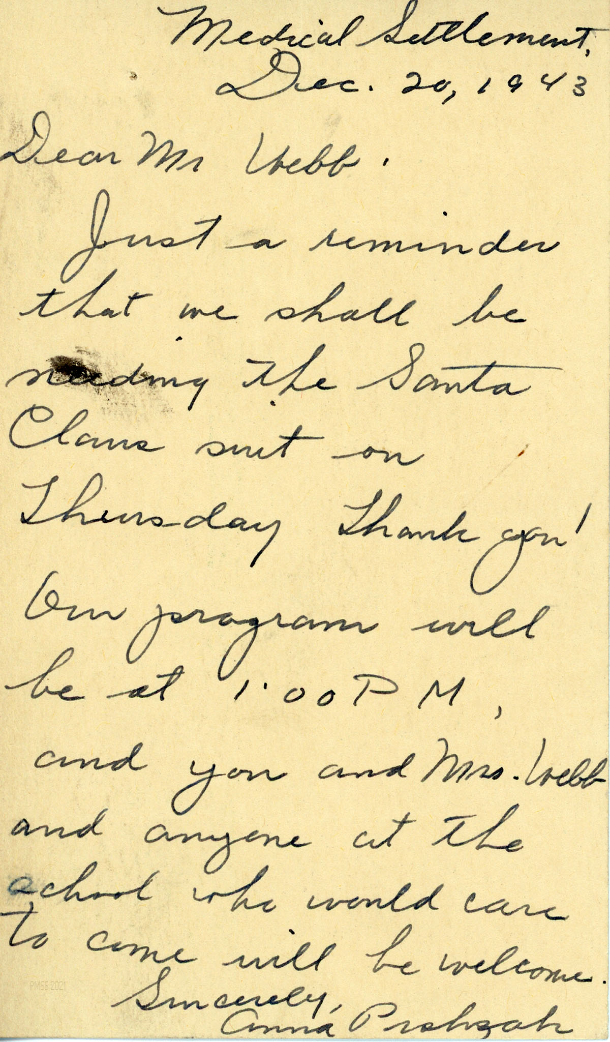 [041] December 15, 1941. To Mrs. Morris from Pishzak, asking to borrow items for a Christmas program; invites PMSS staff.