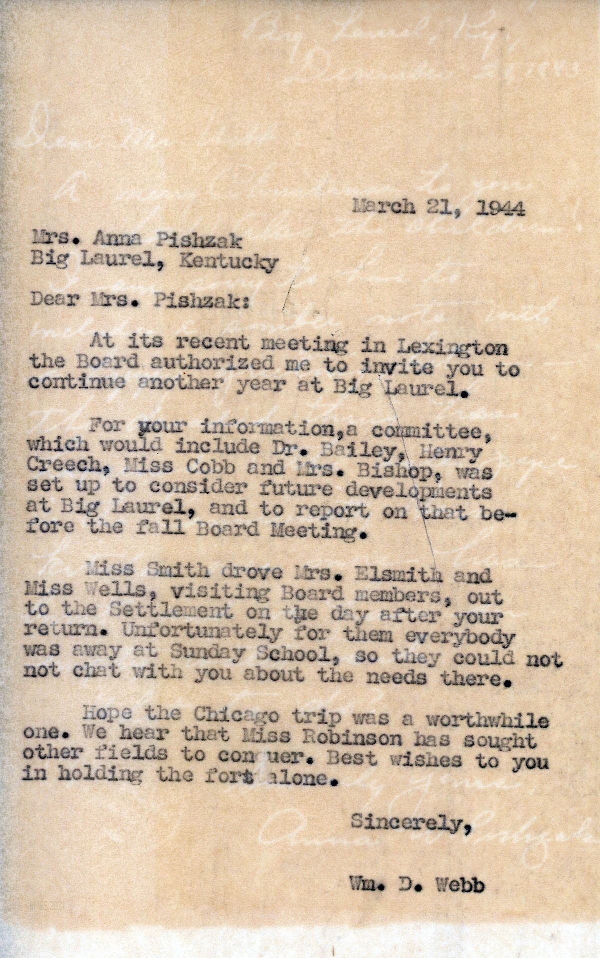 [073] March 21, 1944. To Pishzak from Webb, who invites Pishzak to “continue another year at Big Laurel. … [A] committee, which would include Dr. [Clark] Bailey, Henry Creech, Miss [Alice] Cobb, and Mrs. [Birdena] Bishop, was set up to consider future developments at Big Laurel….” Miss Smith drove Mrs. [Dorothy Olcott] Elsmith and Miss [Evelyn K.] Wells, visiting Board members to M.S., but everyone was away at Sunday School. Mentions hearing that Miss Robinson is leaving M.S.