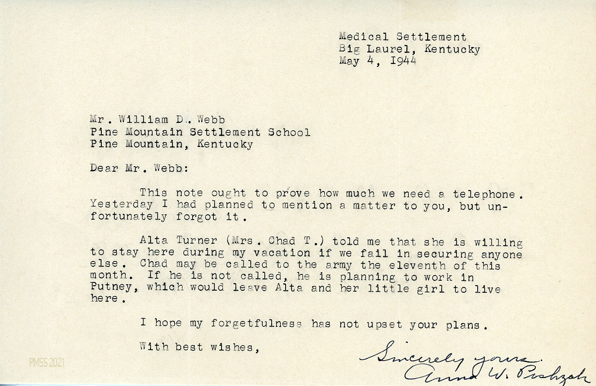 [076] May 4, 1944. Typewritten letter to Webb from Pishzak, quoting from Miss Robinson’s letter about returning to Big Laurel. Handwritten postscript: “Miss Robinson does not know that I am leaving. However, there is no reason why she cannot be told the fact now, with the precaution that she does not write about the matter to anyone here.”