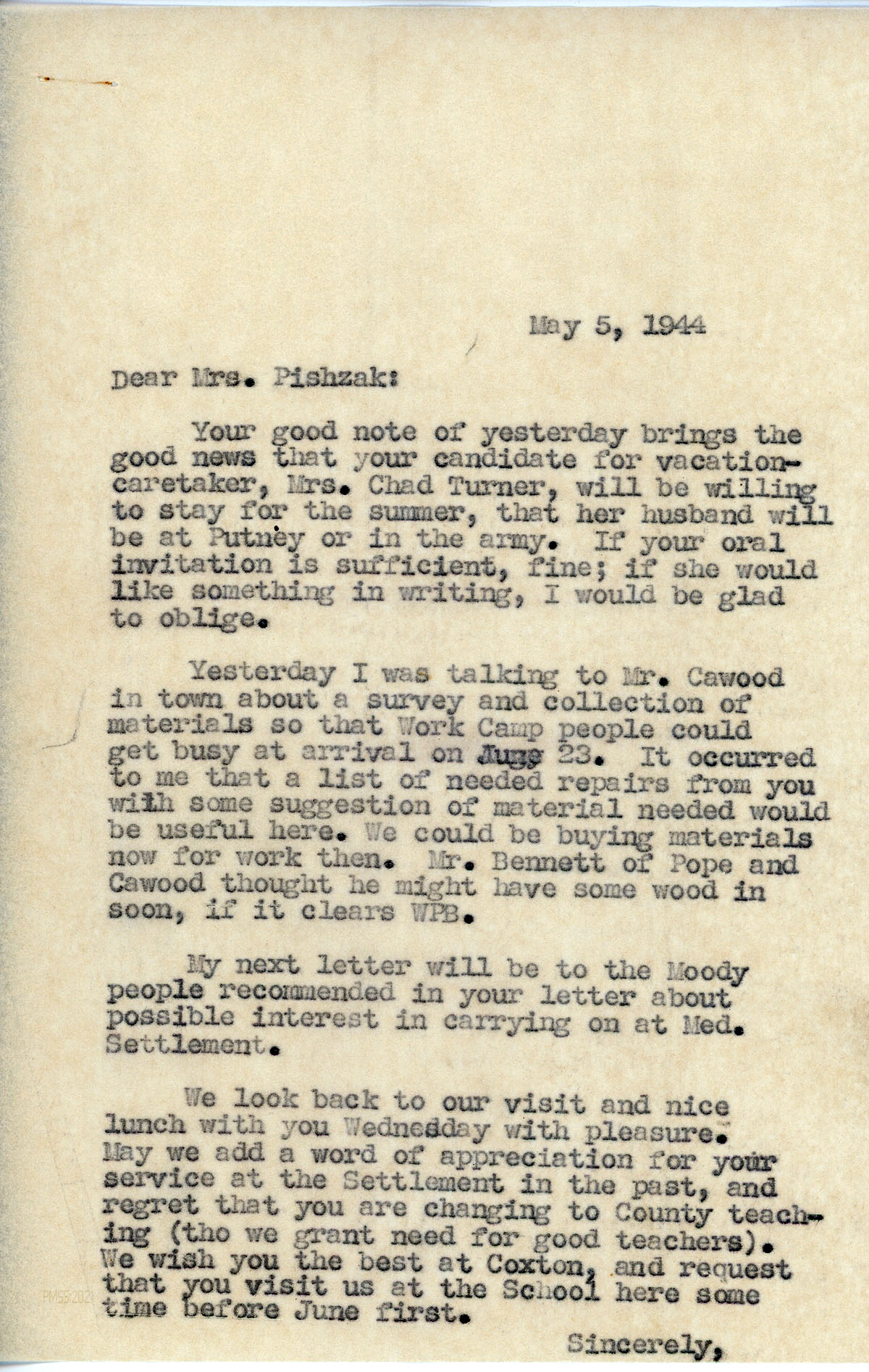[077] May 5, 1944. To Pishzak from Webb, who may find the need for material and repairs useful for the Work Camp people when they arrive on June 23. “May we add a word of appreciation for your service at the Settlement in the past, and regret that you are changing to County teaching…. We wish you the best at Coxton….”