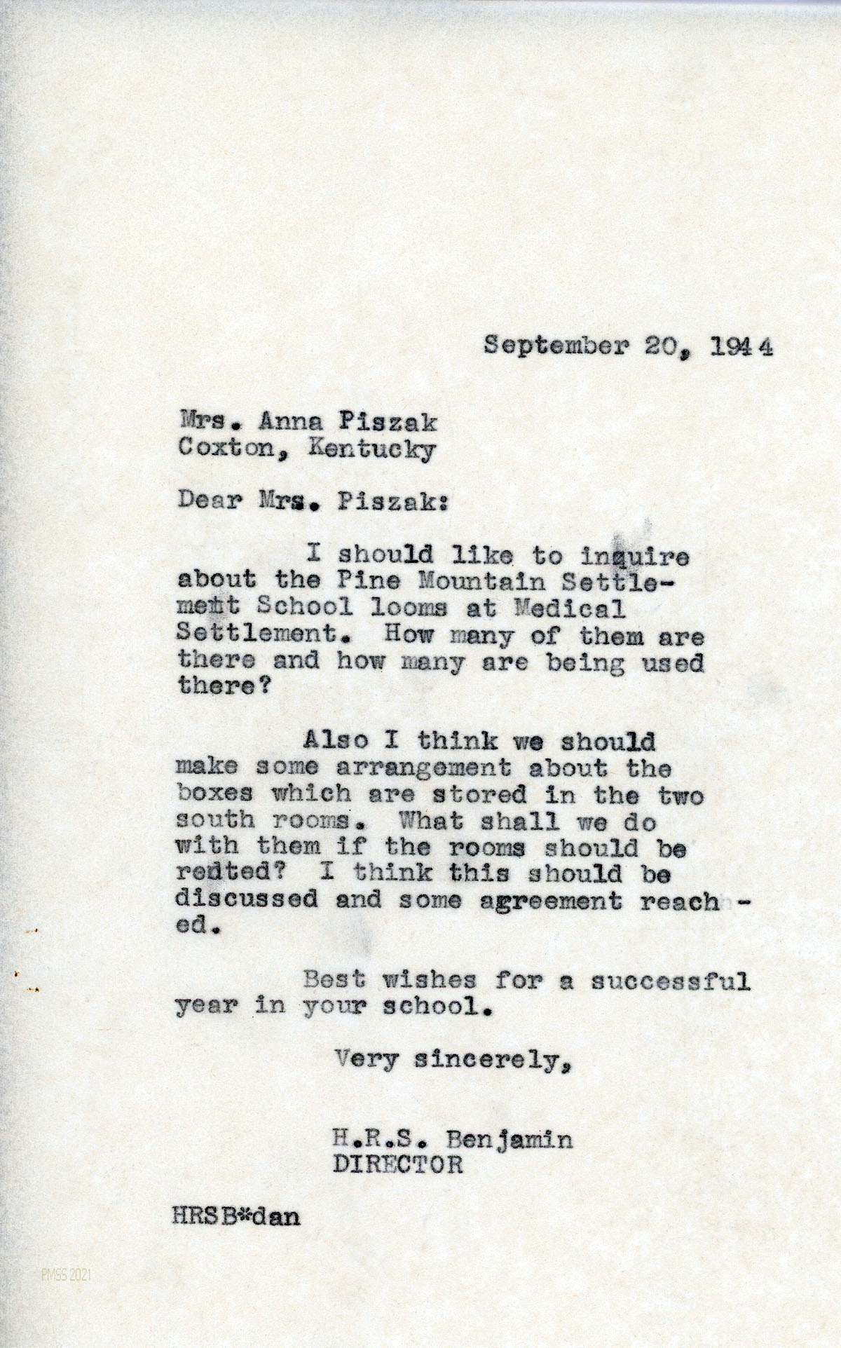 [083] September 20, 1944. To Pishzak in Coxton, KY, from H.R.S. Benjamin, Director, asking about the looms and boxes at M.S.