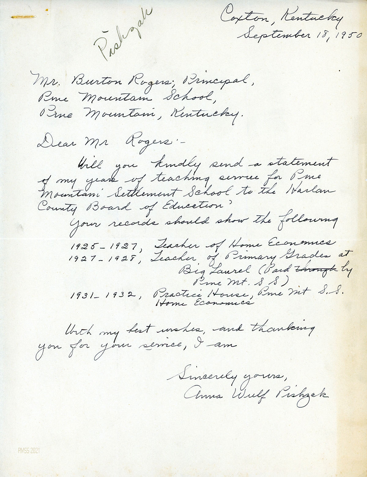 [085] September 18, 1950. To Burton Rogers, PMSS Principal, from Pishzak in Coxton, KY, asking him to send a statement of her PMSS teaching to the Harlan County Board of Education, that should include: