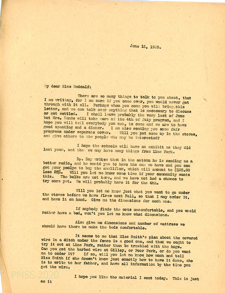 034-034b June 15, 1923. Three-page letter to Medcalf from [unsigned], [034] who is leaving at the last of June. Mentions preparations for the Fourth of July and the fair. Dr. Day is donating a radio; asks about what to order for “under the stoves before we have fires next Fall,” Cots, mattresses; barbed wire to keep out the hogs; [034a] donated material; linen closet supplies from Mrs. Rannels; $5 donation rom Miss Anna M. Johnston of Michigan for Line Fork bathroom; mentions Miss [Louise] Will, Corda, Miss Williamson, Miss Hopkins; asks if she received the equipment for the school cooking classes; Miss [Rita Rebecca] Roeder in Oberlin, OH, may visit; loaning “divided skirts…to ride across in.” [034b] Hopes Miss Smith will visit.