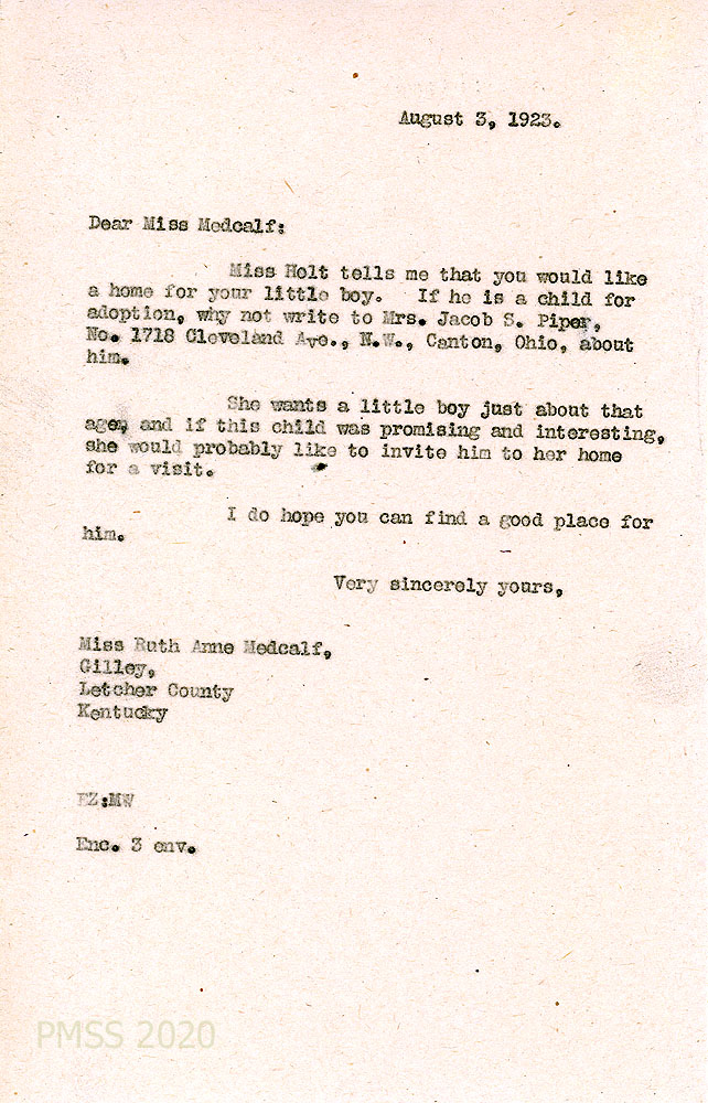 037 August 3, 1923. To Medcalf from EZ [Zande]. Mrs. Jacob S. Piper of Canton, OH, may be interested in adopting the “little boy.”