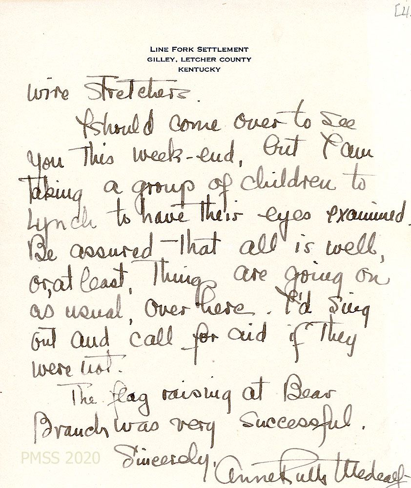 047-047c December 14, 1923. Four-page letter to Pettit from Medcalf on “Line Fork Settlement” stationary. [047] Explains why she hasn’t visited PMSS. Writes news about Bear Branch (now having hot lunches) & Coil Branch. [047a] Has concerns about the horse’s health; mentions Dr. Estabrook. [047b] The wire fence is finished. Mentions Mr. Browning [047c] who is taking children to Lynch for eye exams; assures that “all is well, or at least, things are going on as usual over here.” Mentions flag-raising at Bear Branch.