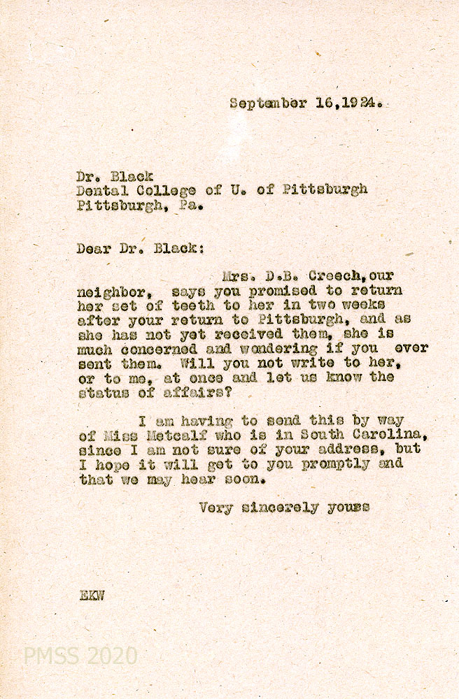 053 September 16, 1924. To Dr. Black, Dental College of University of Pittsburgh (PA), from EKW [Wells] via Medcalf, asking him to contact Wells or Mrs. D.B. Creech about her teeth.