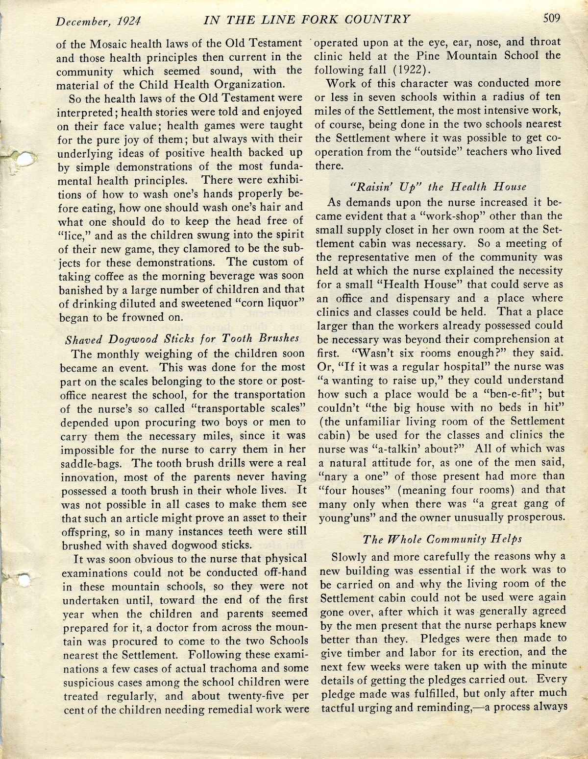 - Magazine article: Anne Ruth Medcalf – “In the Line Fork Country,” American Child Health Magazine, December 1924. p. 2. [lin_frk_1924_002.jpg]