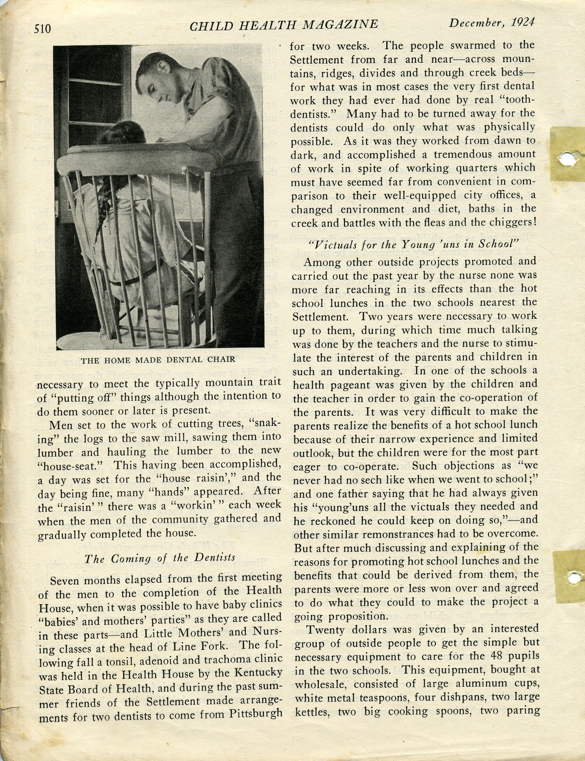 “THE HOMEMADE DENTAL CHAIR,” “In the Line Fork Country” by Anne Ruth Medcalf, American Child Health Magazine, Dec. 1924, p. 510.
