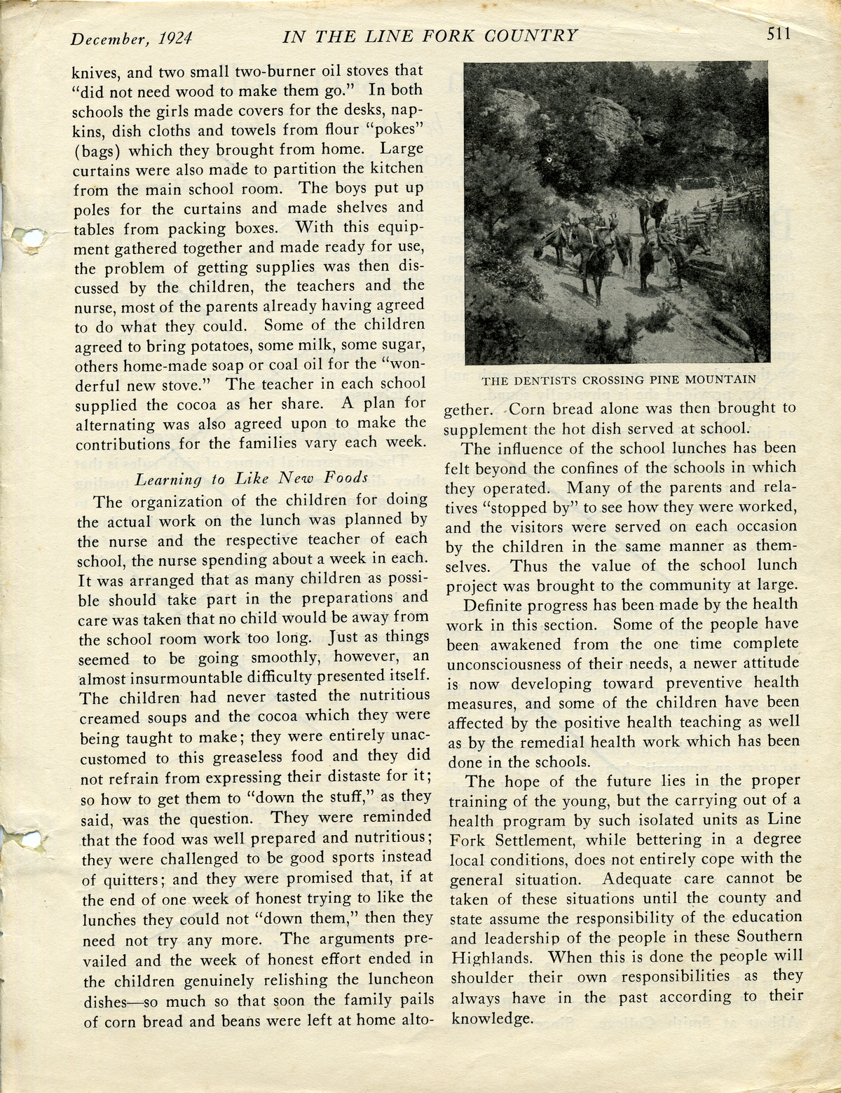 “THE DENTISTS CROSSING PINE MOUNTAIN” — “In the Line Fork Country” by Anne Ruth Medcalf, American Child Health Magazine, Dec. 1924, p. 511.
