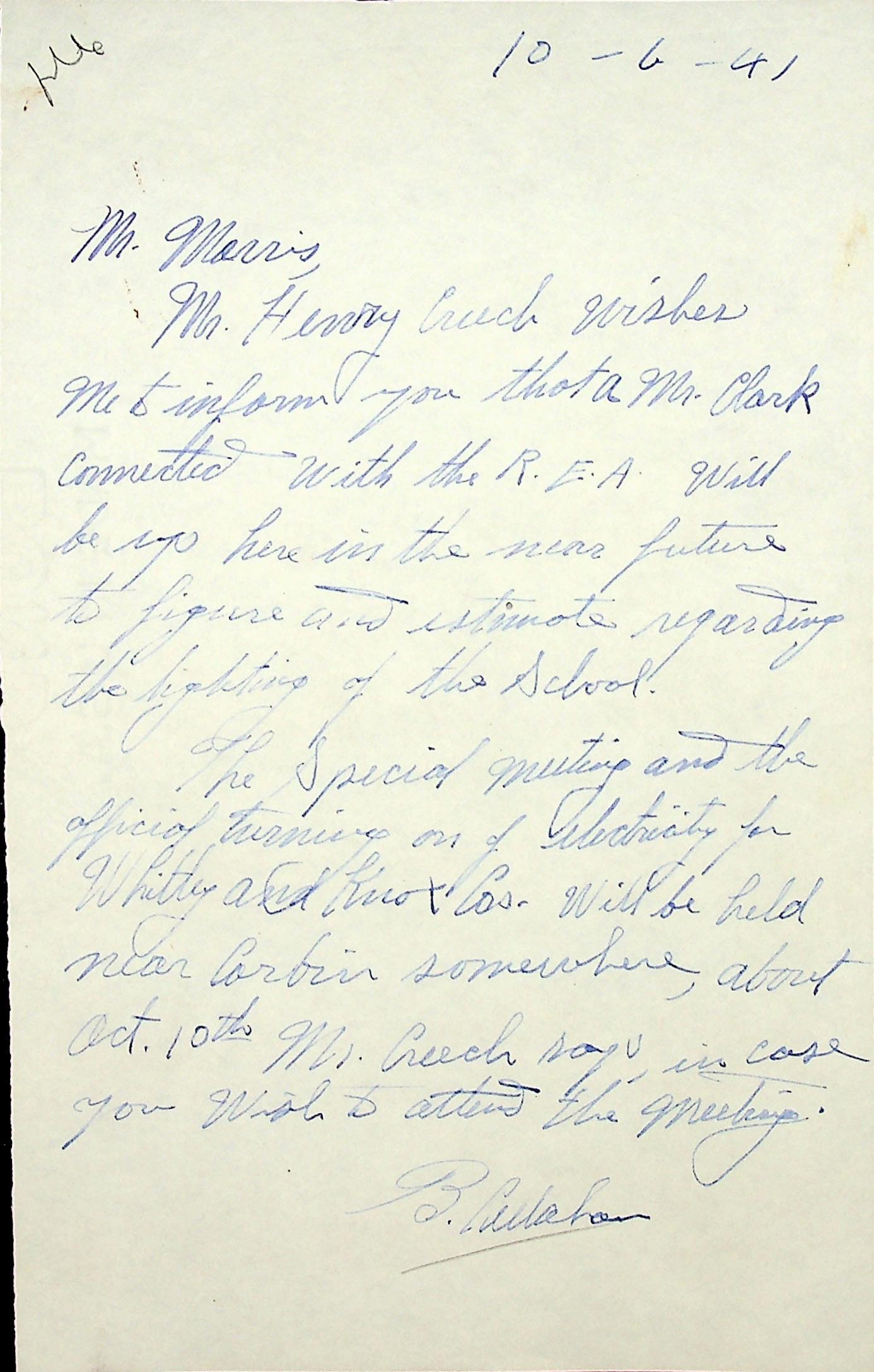(65) October 6, 1941. To Mr. Morris from B. Callahan. “Mr. Henry Creech wishes me to inform you that a Mr. Clark connected with the R.E.A. will be up here in the near future to figure and estimate regarding the lighting of the School. The special meeting and the official turning on of electricity for Whitley and Knox Cos. will be held near Corbin somewhere, about Oct. 10th….”