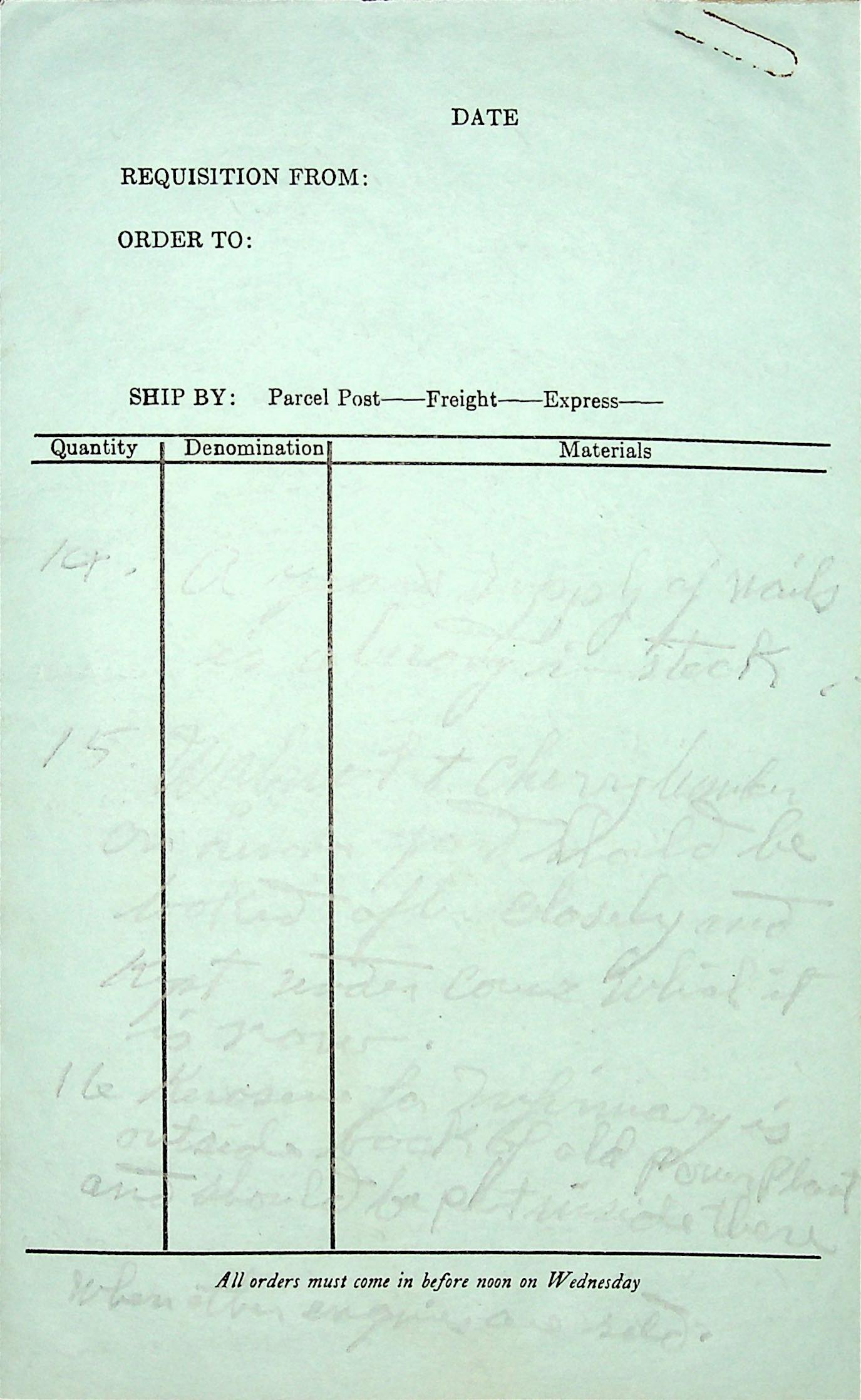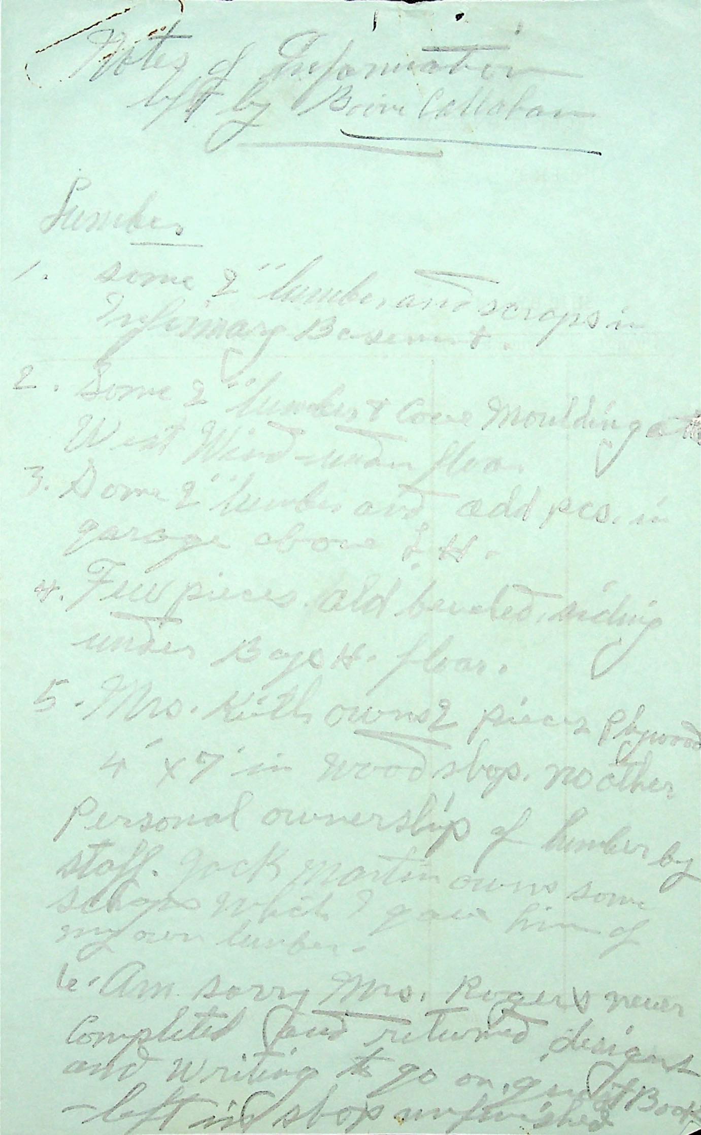 (68) (69) (70) (71) January 20, 1942. Four-page handwritten “Notes of Information Left by Boone Callahan,” covering (68) lumber (size, location, ownership). “Am sorry Mrs. [Mary] Rogers never completed and returned designs and writing to go on Guest Book. Left in shop unfinished.” (69, page 2) Care of “the Diesels in the old Power H[ouse].” Damaged window; location of metal sash putty from West Wind construction; (70, page 3) lumber from workshops; lumber under Shop floor; hot water tank valve is leaking in Laurel House basement; location of asphalt roofing shingles and eave trough & fittings; (71, page 4) [Written on a blank Requisition form; writing is too faded to fully decipher.] nails; cherry lumber; kerosene for the Infirmary.