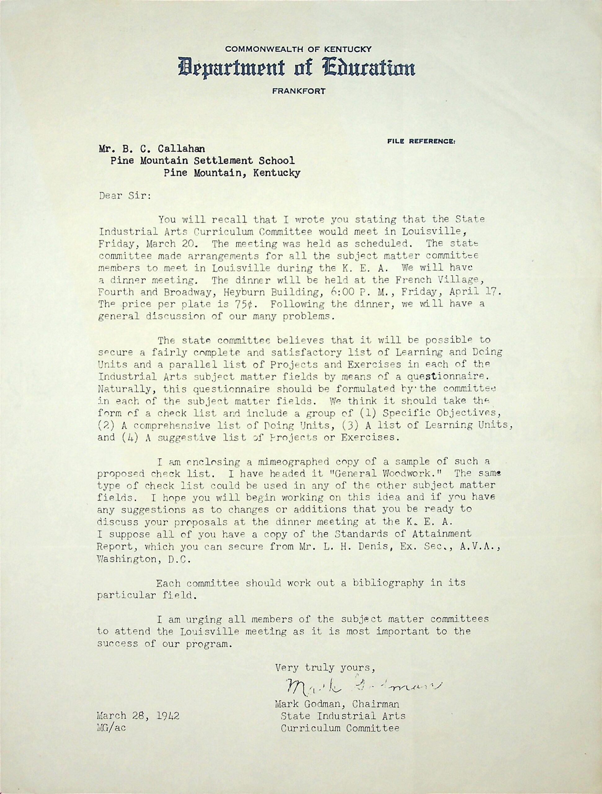 (73) March 28, 1942. To Mr. Callahan from Mark Godman, Kentucky Department of Education, Frankfort. A reminder of the dinner meeting on March 20 in Louisville during the K.E.A. The committee plans to secure 2 lists: Learning and Doing Units and Projects and Exercises in each of the Industrial Arts fields using a questionnaire; asks Boone to submit a checklist and a bibliography.