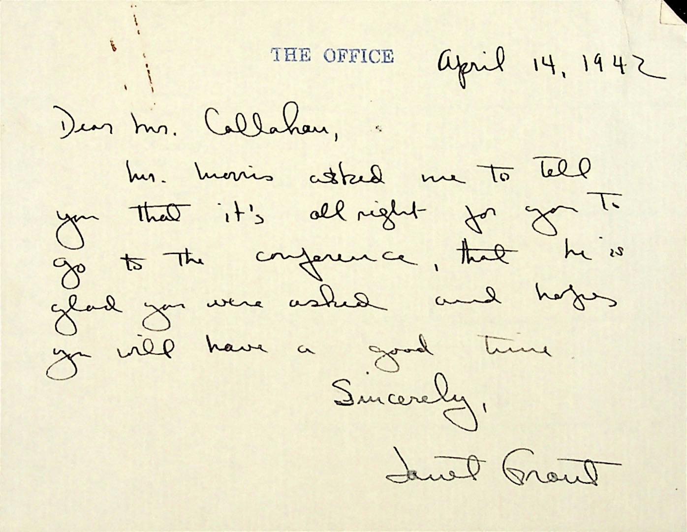 (75) April 14, 1942. Handwritten note to Mr. Callahan from Janet Grout in The Office, stating that Mr. Morris permits Boone to attend the meeting.