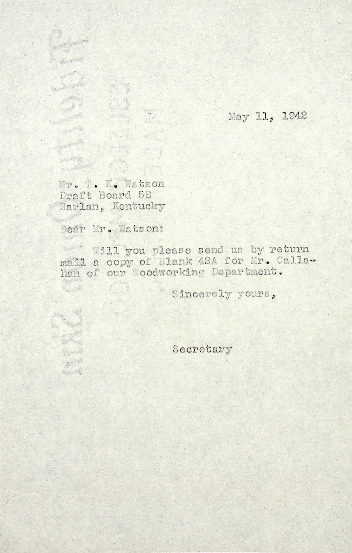 (77) May 11, 1942. To Mr. T.K. Watson, Draft Board, Harlan, KY, from [unsigned], Secretary, Asking for a copy of Blank 42A for Mr. Callahan.