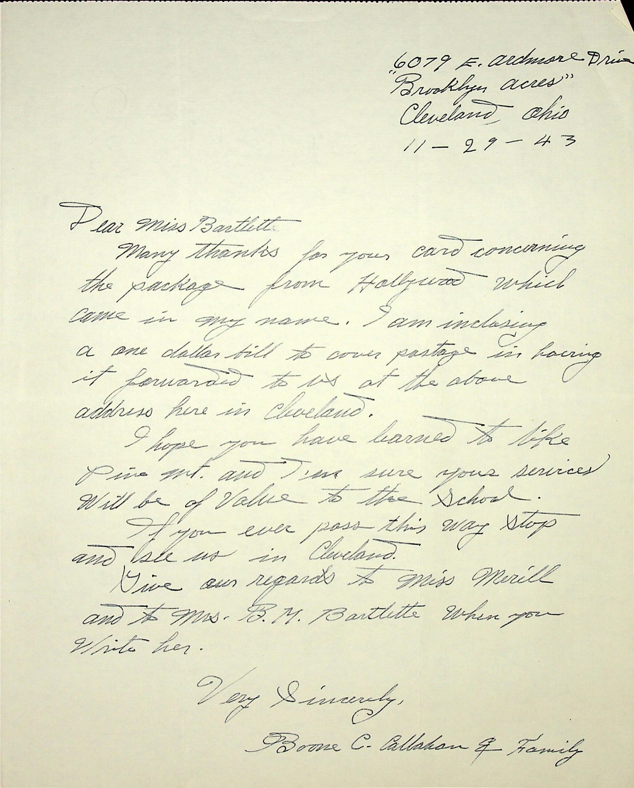 (90) November 29, 1943. To Miss [Helen] Bartlett at PMSS from Boone C. Callahan & Family in Cleveland, OH, thanking her for forwarding a package from Hollywood to the Callahans. Sends regards to Miss Merill (sic, Josephine Merrill) and Mrs. B.M. Bartlette (sic, Barbara Merrill Bartlett].