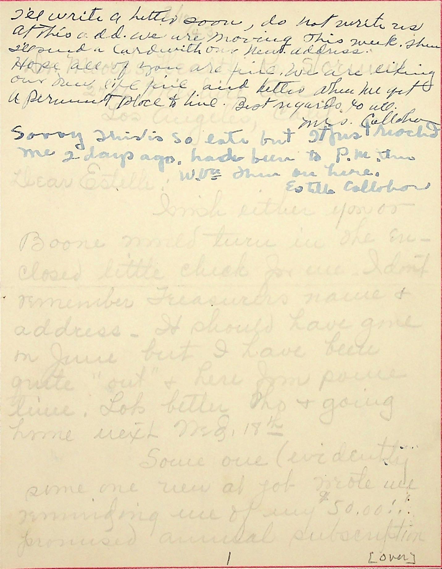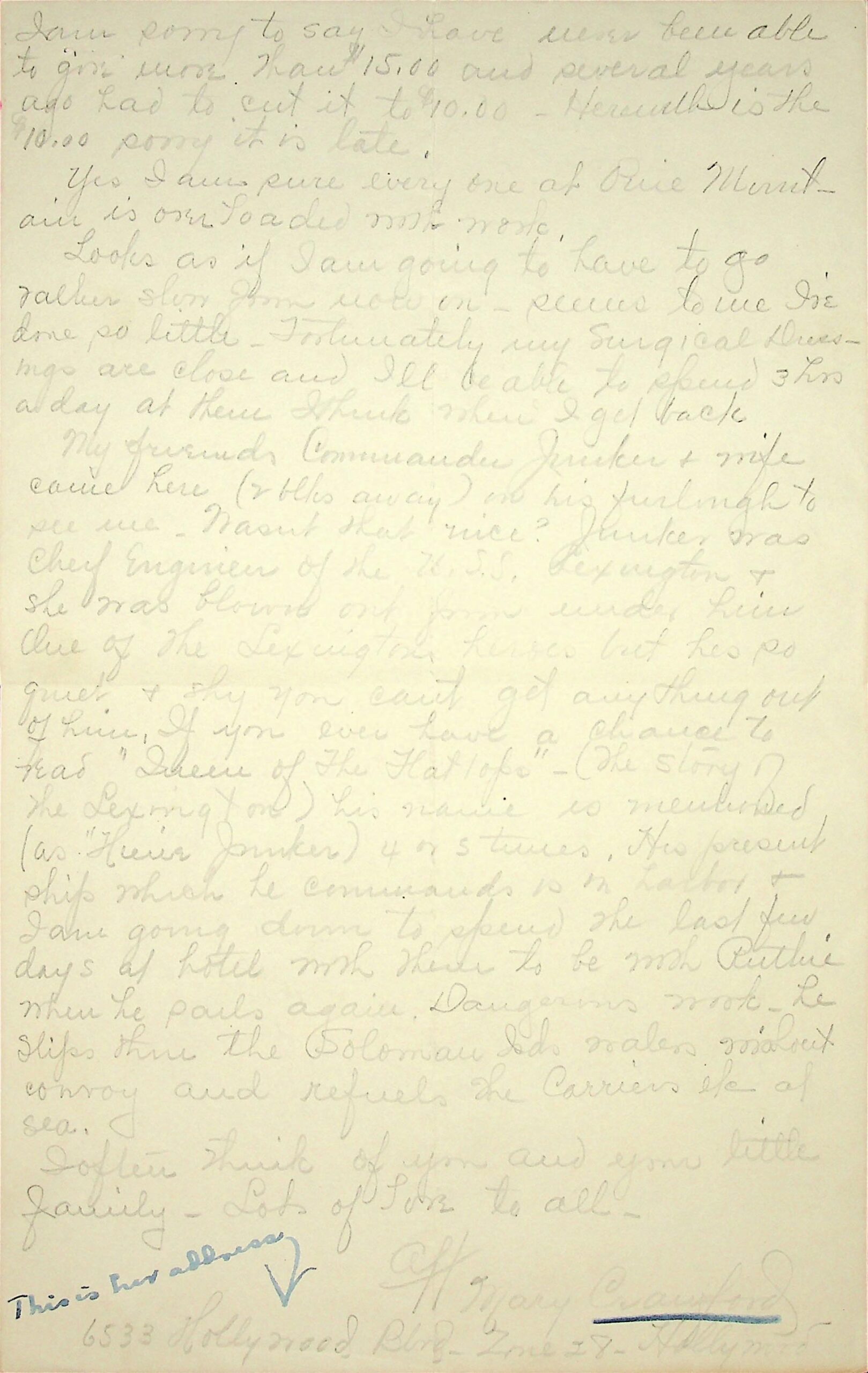 (92) (93) N.D. Faded 2-page letter to Estelle Callahan from Mary Crawford in Hollywood, CA, (92) who encloses a check for her annual subscription. [A notation from Mrs. Callahan at the top of the page states she will write soon and that she has a new address. Followed by a notation from Estelle Callahan.] (93) A continuation of the letter from Crawford describing a visit by her friends, Commander & Mrs. Junker and Junker’s war experiences.