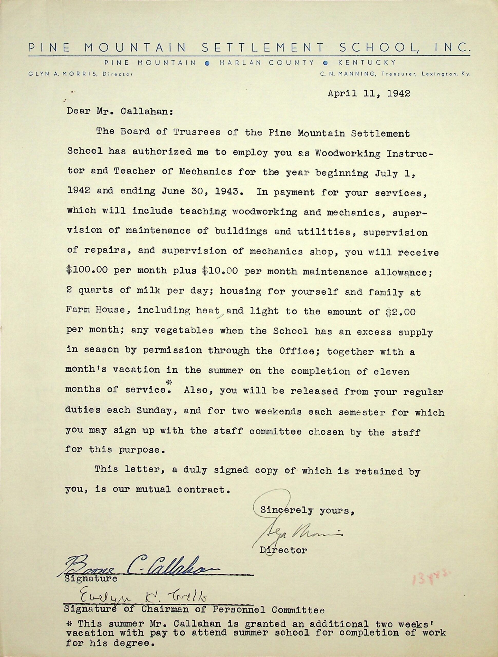 (96) April 11, 1942. To Mr. Callahan from Glyn Morris, Director, on PMSS letterhead. A contract confirming the employment of Callahan as Woodworking Instructor and Teacher of Mechanics for July 1942 through June 1943. He describes the job responsibilities; payments; 2 quarts of milk per day; housing in Farm House; excess vegetables; a month’s vacation in the summer after 11 months of service; Sundays and two weekends each semester off; and 2 weeks with pay to attend summer school to complete his degree. Signed by Boone C. Callahan & Evelyn K. Wells, Chairman of Personnel Committee.
