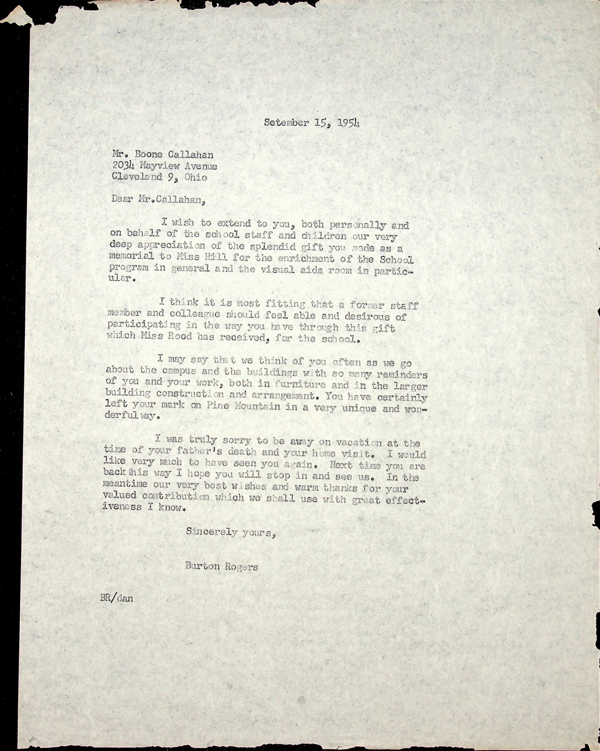 (99) September 15, 1954. To Mr. Callahan in Cleveland, OH, from Burton Rogers, who thanks Callahan for the gift he made “as a memorial to Miss [Gladys] Hill for the enrichment of the School program in general and the visual aids room in particular.” Received by Miss [Grace] Rood. “I may say that we think of you often as we go about the campus and the buildings with so many reminders of you and your work, both in furniture and in the larger building construction and arrangement. You have certainly left your mark on Pine Mountain in a very unique and wonderful way.”