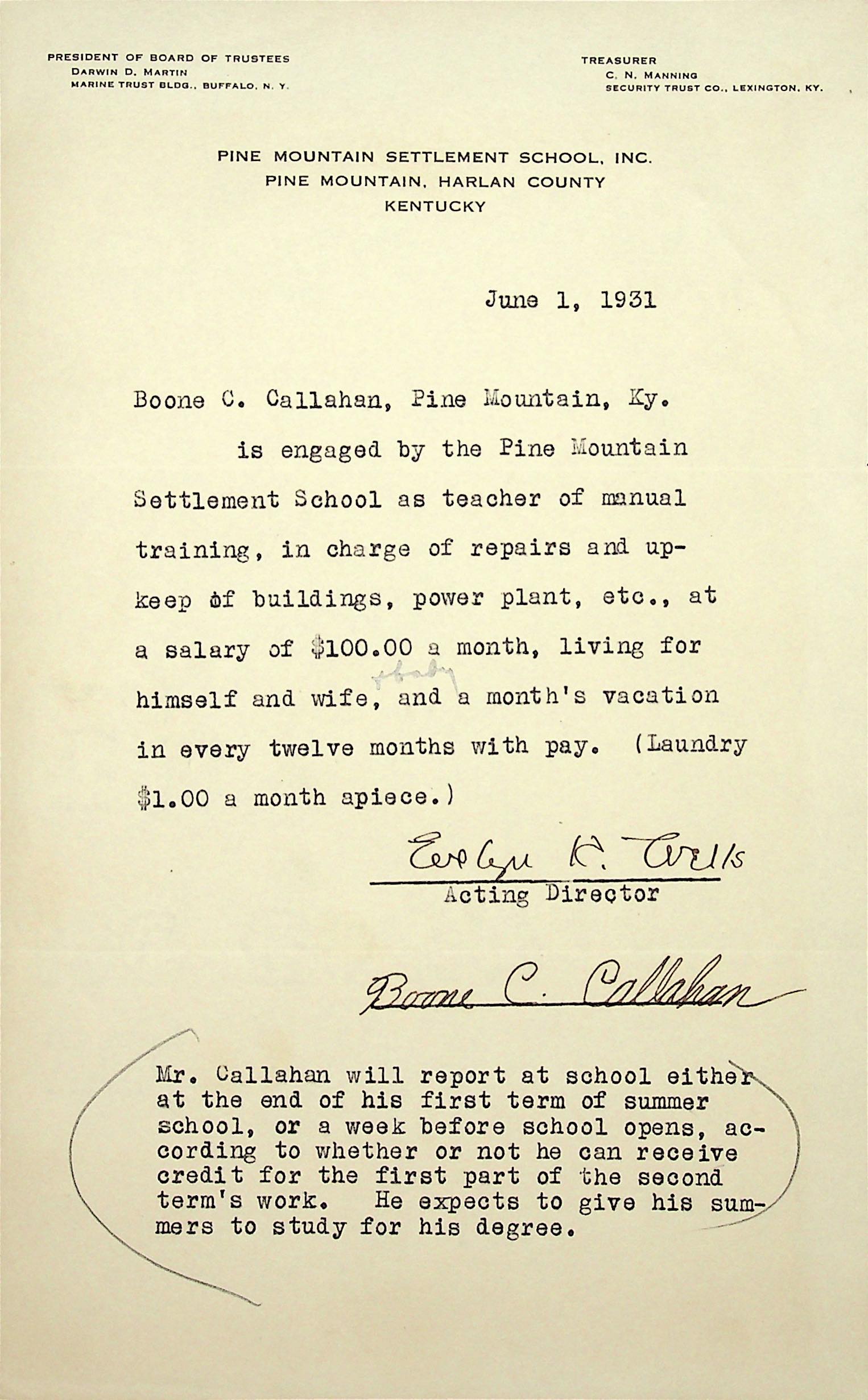(10) June 1, 1931. Contract for Boone C. Callahan, signed by Evelyn K. Wells & Boone. Boone is engaged by PMSS “as teacher of manual training, in charge of repairs and upkeep of buildings, power plant, etc., at a salary of $100.00 a month, living for himself and wife, and a month’s vacation in every twelve months with pay. (Laundry $1.00 a month apiece.) … He expects to give his summers to study for his degree.” He will begin work after summer school.