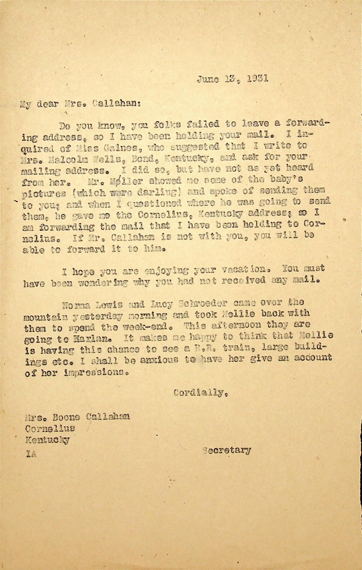 (11) June 13, 1931. To Mrs. Boone Callahan in Cornelius, KY, from IA [Miss I. Aimes], Secretary, who is forwarding Boone’s mail to her, since she doesn’t have a mailing address for Boone. Norma Lewis and Lucy Schroeder came to PMSS to take Nellie back with them for the weekend.