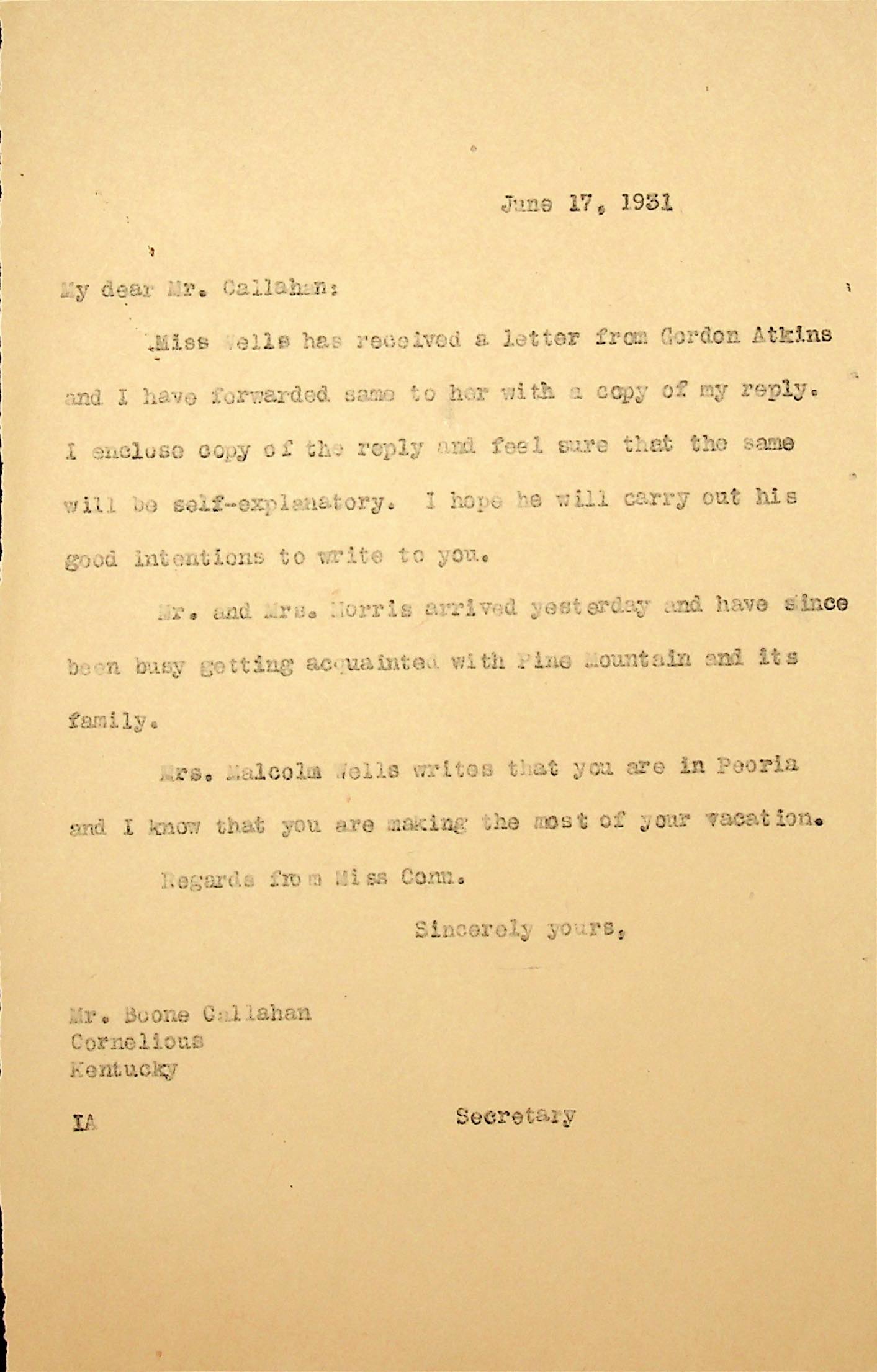 (12) June 17, 1931. To Mr. Callahan in Cornelius, KY, from IA [Miss I. Aimes], Secretary, who is forwarding a letter to Miss Wells from Gordon Atkins and the secretary’s reply, a copy of which is enclosed. Mr. and Mrs. Glyn Morris have arrived. Mentions Mrs. Malcolm Wells and Miss Conn.