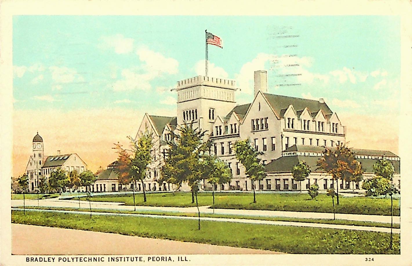 (14) Front side of postcard with color drawing of Bradley Polytechnic Institute, Peoria, ILL. (15) July 2, 1931. Postcard To Mr. Morris from B.C. Callahan in Peoria, IL, welcoming him and his wife to PMSS; will arrive after July 24 when the term ends.