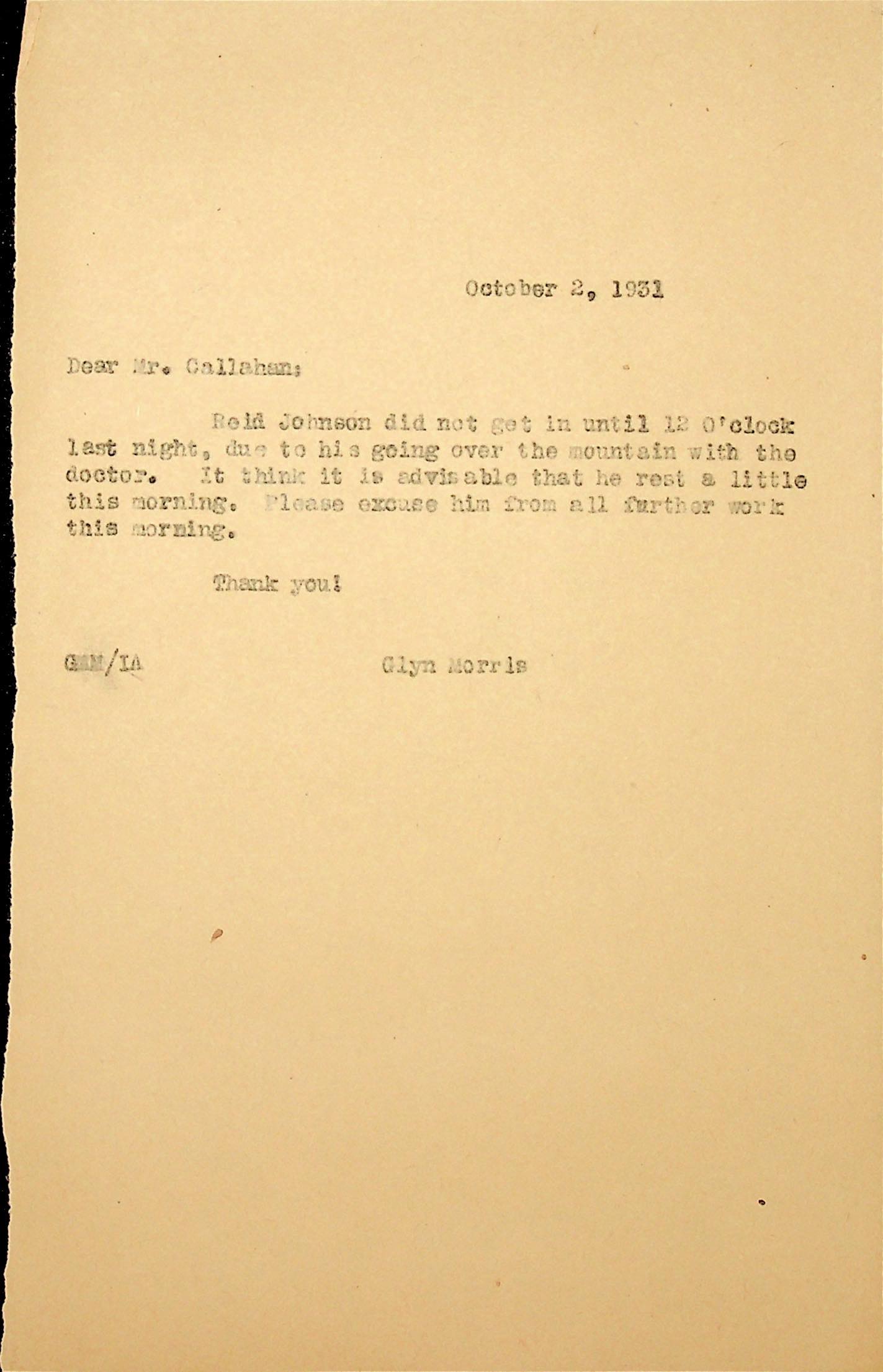 (16) October 2, 1931. To Mr. Callahan from Glyn Morris, who asks him to excuse Reid Johnson who came in late last night after “going over the mountain with the doctor.”