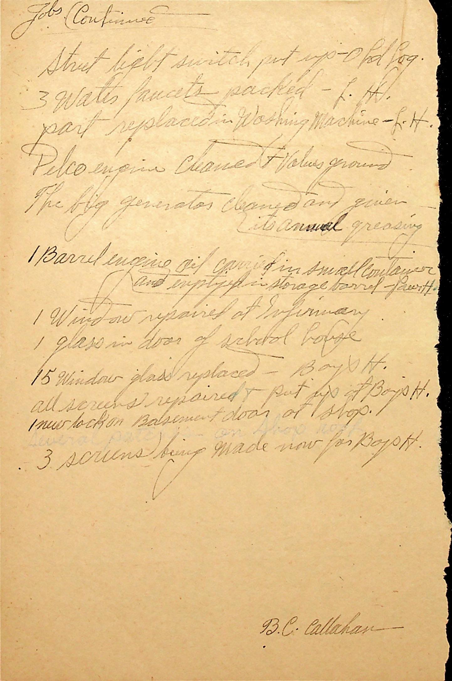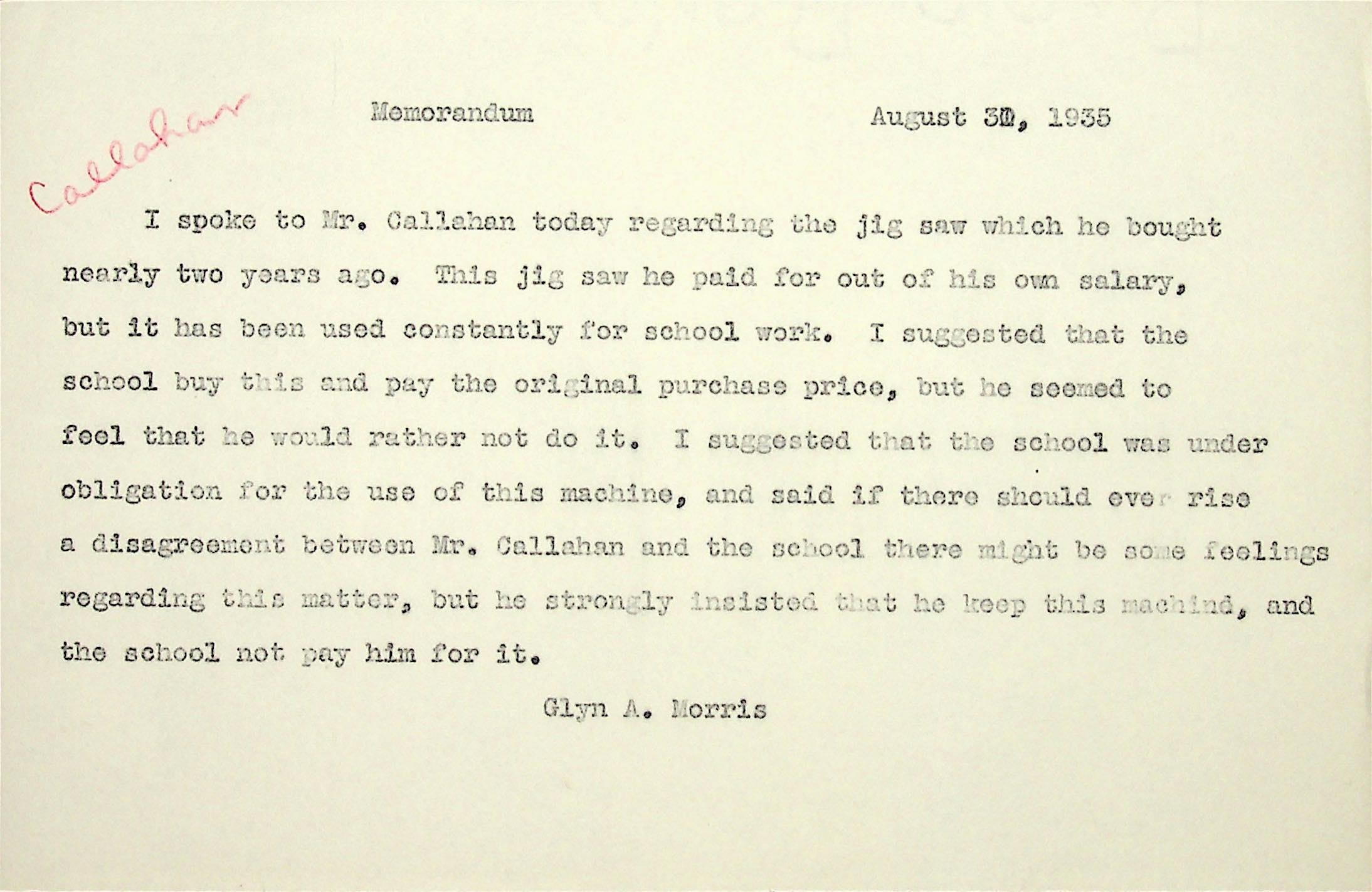(21) August 30, 1935. Memorandum from Glyn A. Morris (“Callahan” is handwritten on top left of page.) Morris confirms in the memo that, since Mr. Callahan’s jig saw is in use “constantly for school work,” that the school should buy it. However, Callahan “strongly insisted that he keep this machine and the school not pay him for it.”