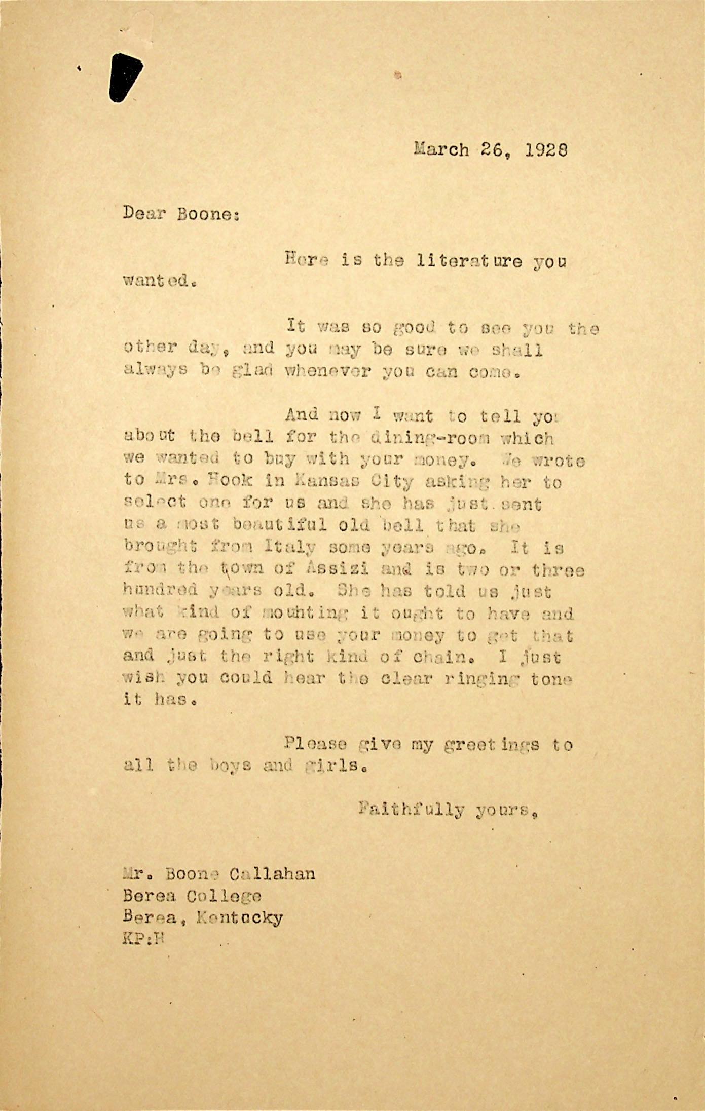 (2) March 26, 1928.To Boone at Berea College from KP, who sends him literature; enjoyed his visit. Writes about the bell for the dining room that the School is buying with Boone’s donation. “We wrote to Mrs. [Mary Rockwell] Hook in Kansas City asking her to select one for us and she has just sent us a most beautiful old bell that she brought from Italy some years ago. It is from the town of Assizi (sic) and is two or three hundred years old. …”