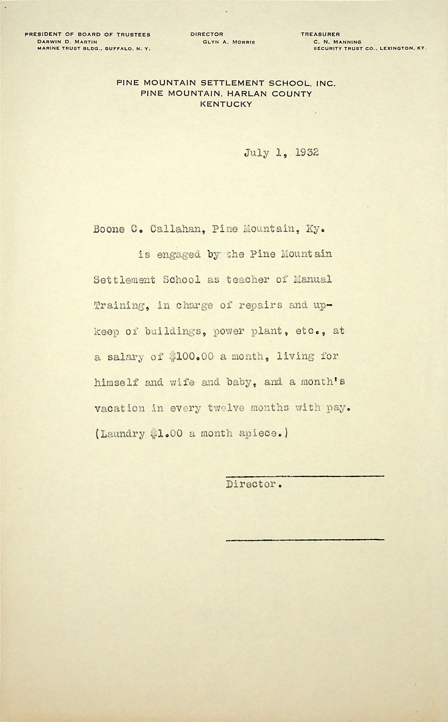 (20) July 1, 1932. Contract (on PMSS letterhead) for Boone C. Callahan, [unsigned]. Boone is engaged by PMSS “as teacher of Manual Training, in charge of repairs and upkeep of buildings, power plant, etc., at a salary of $100.00 a month, living for himself and wife and baby, and a month’s vacation in every twelve months with pay. (Laundry $1.00 a month apiece.)