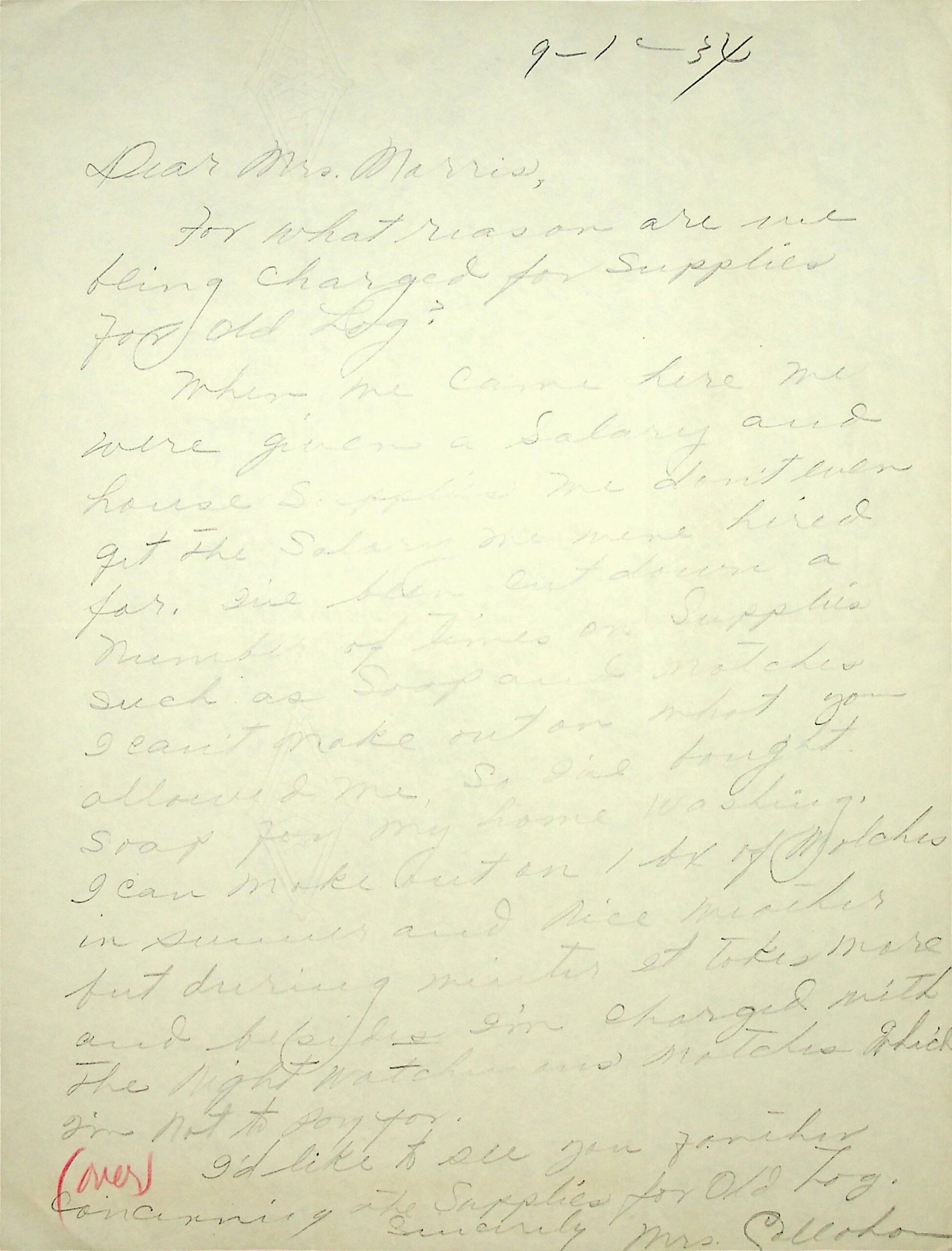 (22) September 1, 1934. Two-sided note to Mrs. Morris from Mrs. Callahan, who asks, “For what reason are we being charged for supplies for Old Log?” She describes the items she pays for herself. (23) Notation on reverse side in different handwriting: “Spoke to Mrs. C. Sat. …Sept. 1 re: contents of this letter.”