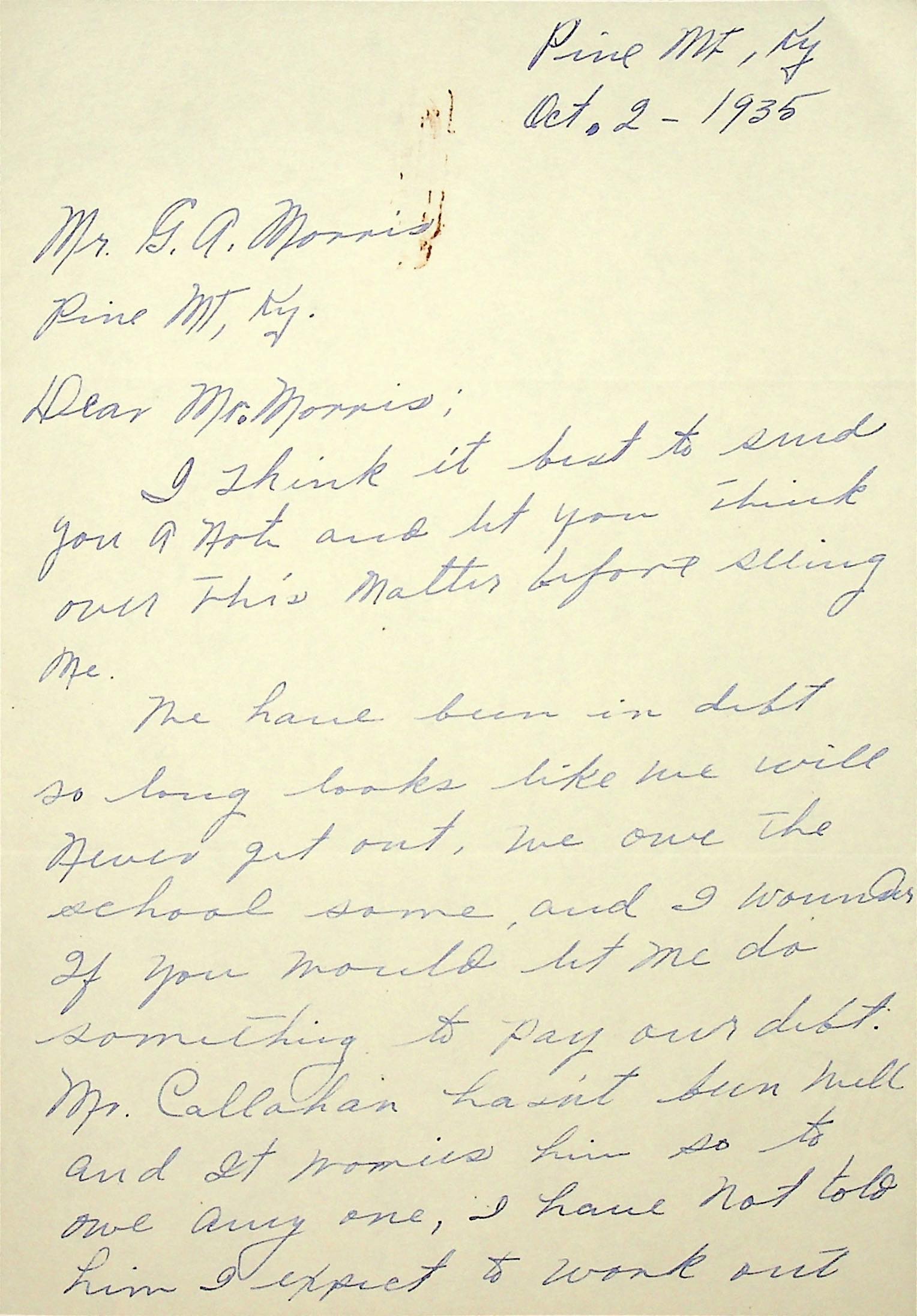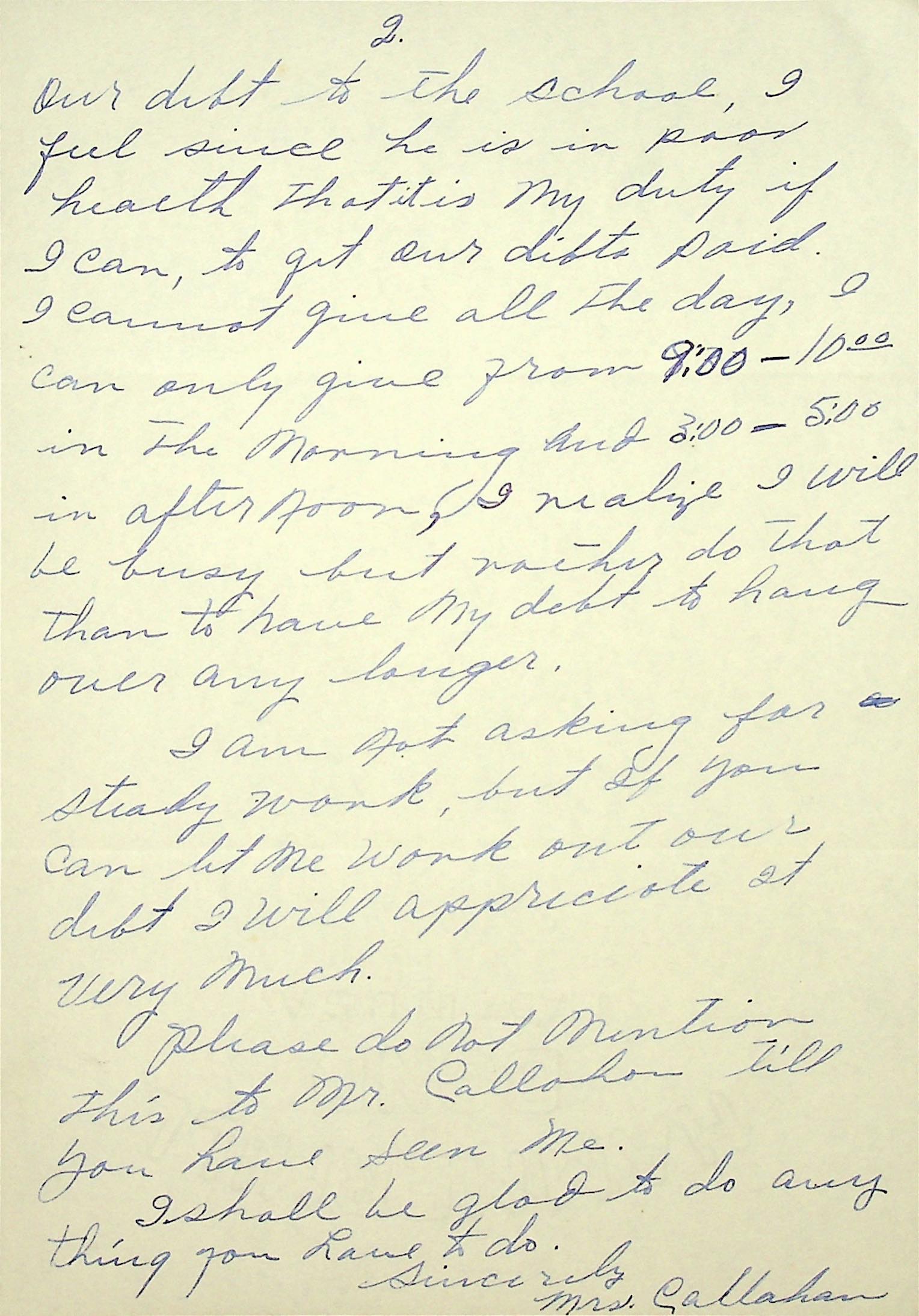 (24) October 2, 1935. Two-page letter to Mr. Morris from Mrs. Callahan, who writes, “We owe the school some and I wonder if you would let me do something to pay our debt. Mr. Callahan hasn’t been well and it worries him so to owe anyone.” (25) “Please do not mention this to Mr. Callahan till you have seen me.”