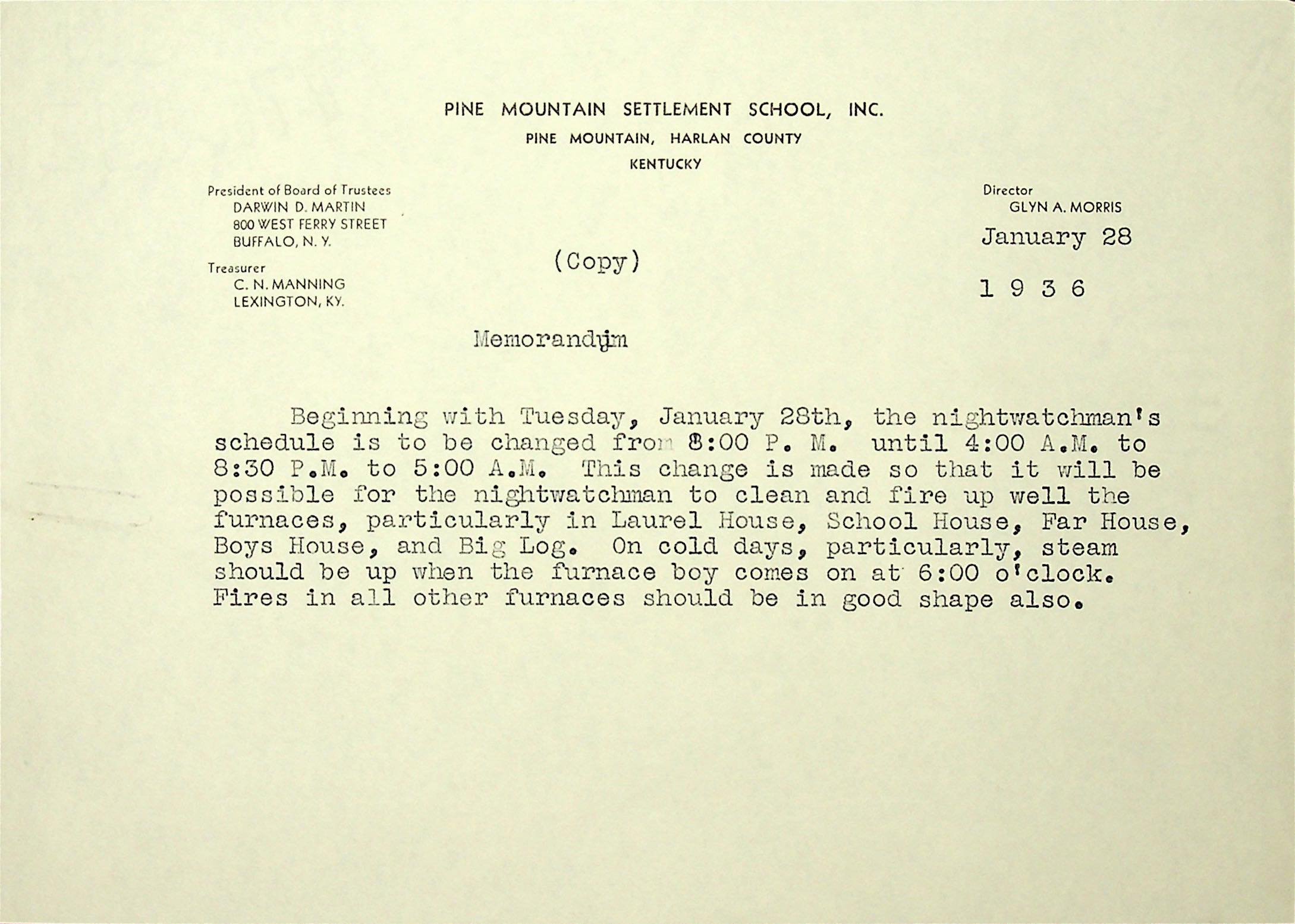 (26) January 28, 1936. Copy of Memorandum on PMSS letterhead, [unsigned], announcing that the nightwatchman’s schedule is to be changed so that he can “clean and fire up well the furnaces” in several buildings.