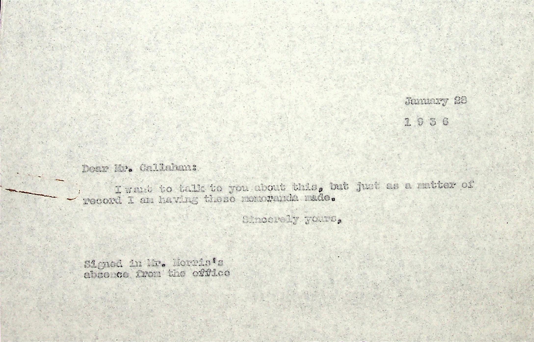 (27) January 28 1936. To Mr. Callahan from Morris. “I want to talk to you about this, but just as a matter of record I am having these memoranda made.”