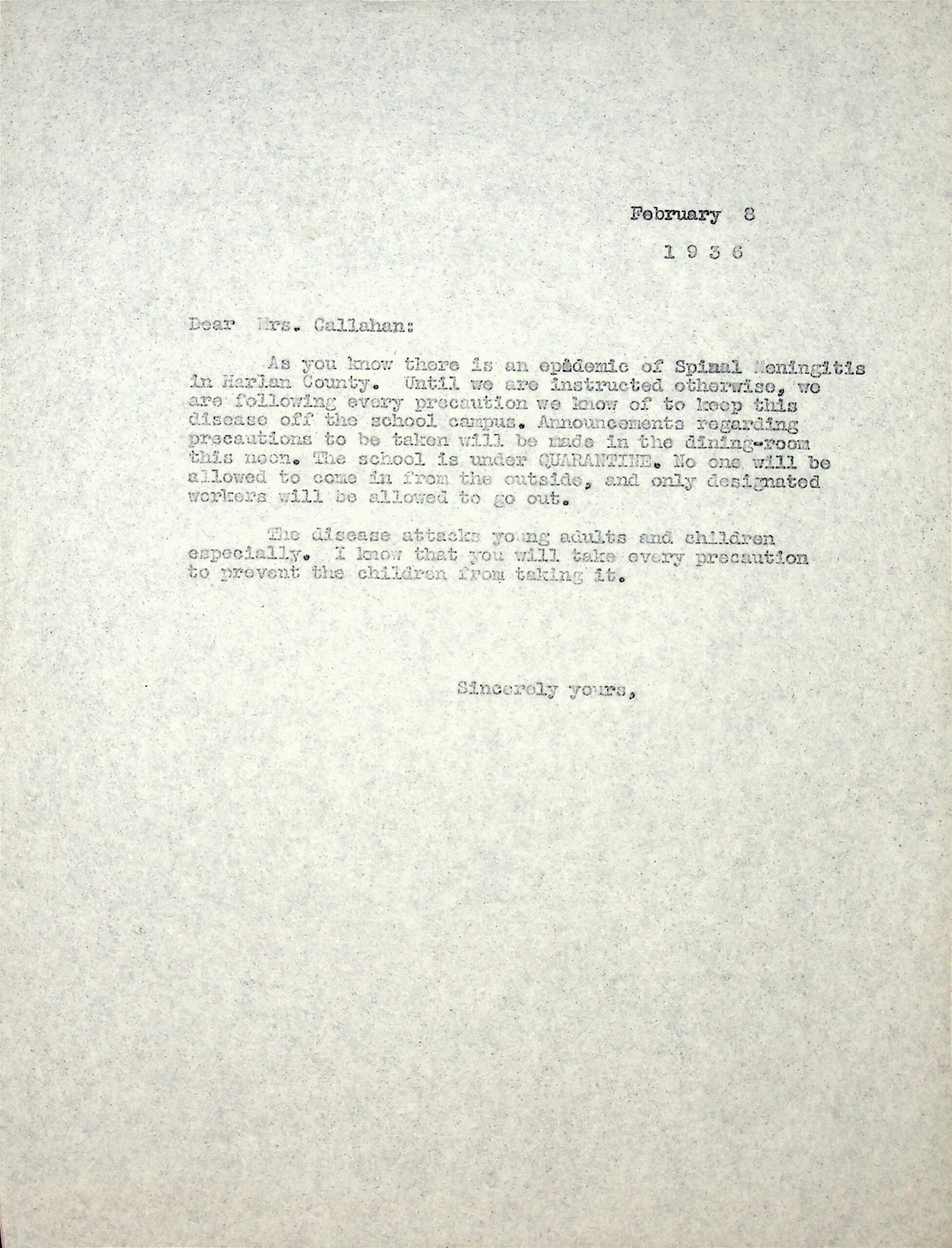 (28) February 8, 1936. To Mrs. Callahan from [unsigned], telling her that the school is under quarantine due to an epidemic of Spinal Meningitis in Harlan County.