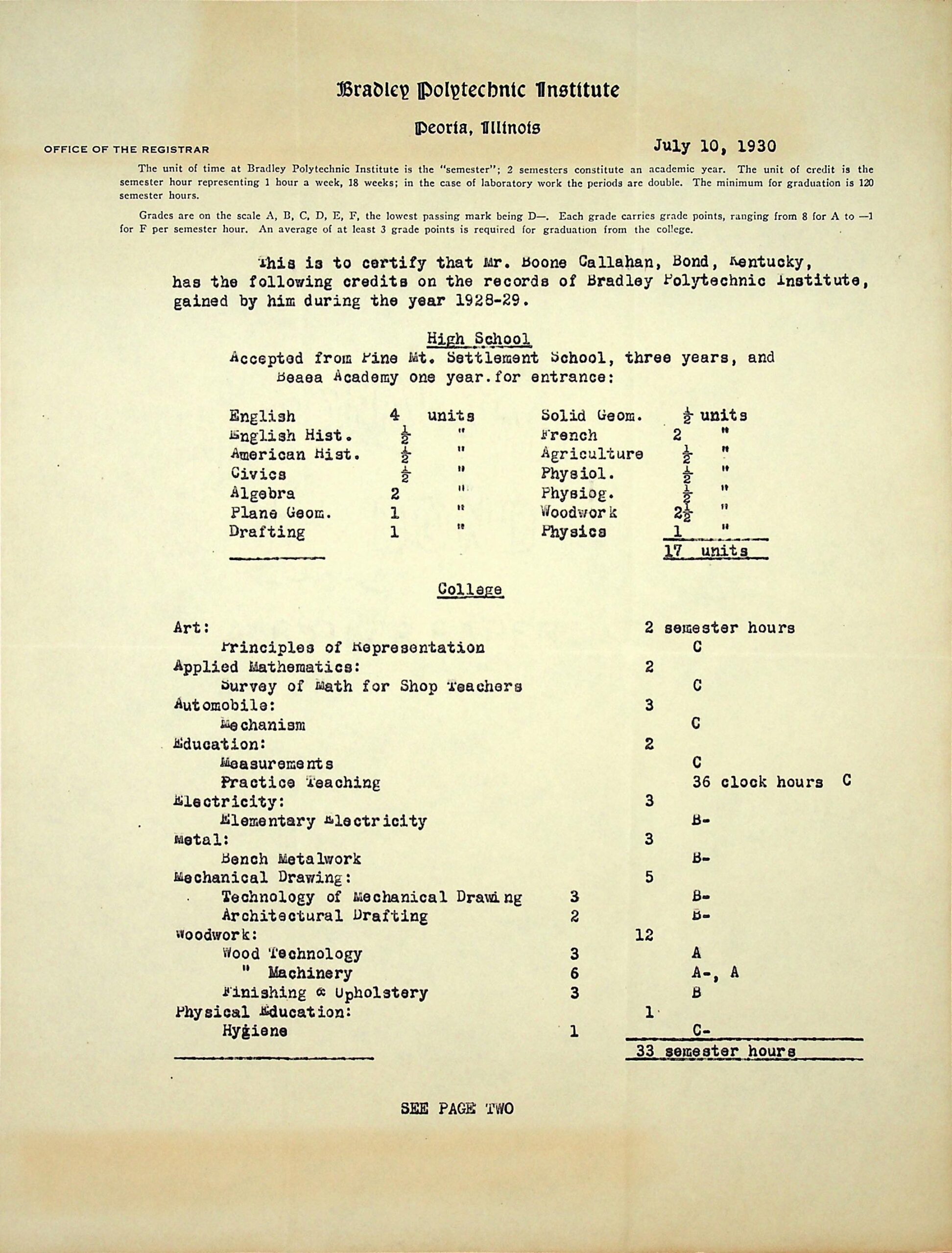 (82) July 10, 1930. Transcript from Office of the Registrar, Bradley Polytechnic Institute, Peoria, IL, certifying credits gained by Mr. Boone Callahan during the year 1928-29. Accepted a total of 17 units at PMSS High School for three years and Berea Academy of one year. Shows College subjects, total of 33 semester hours and grades.
