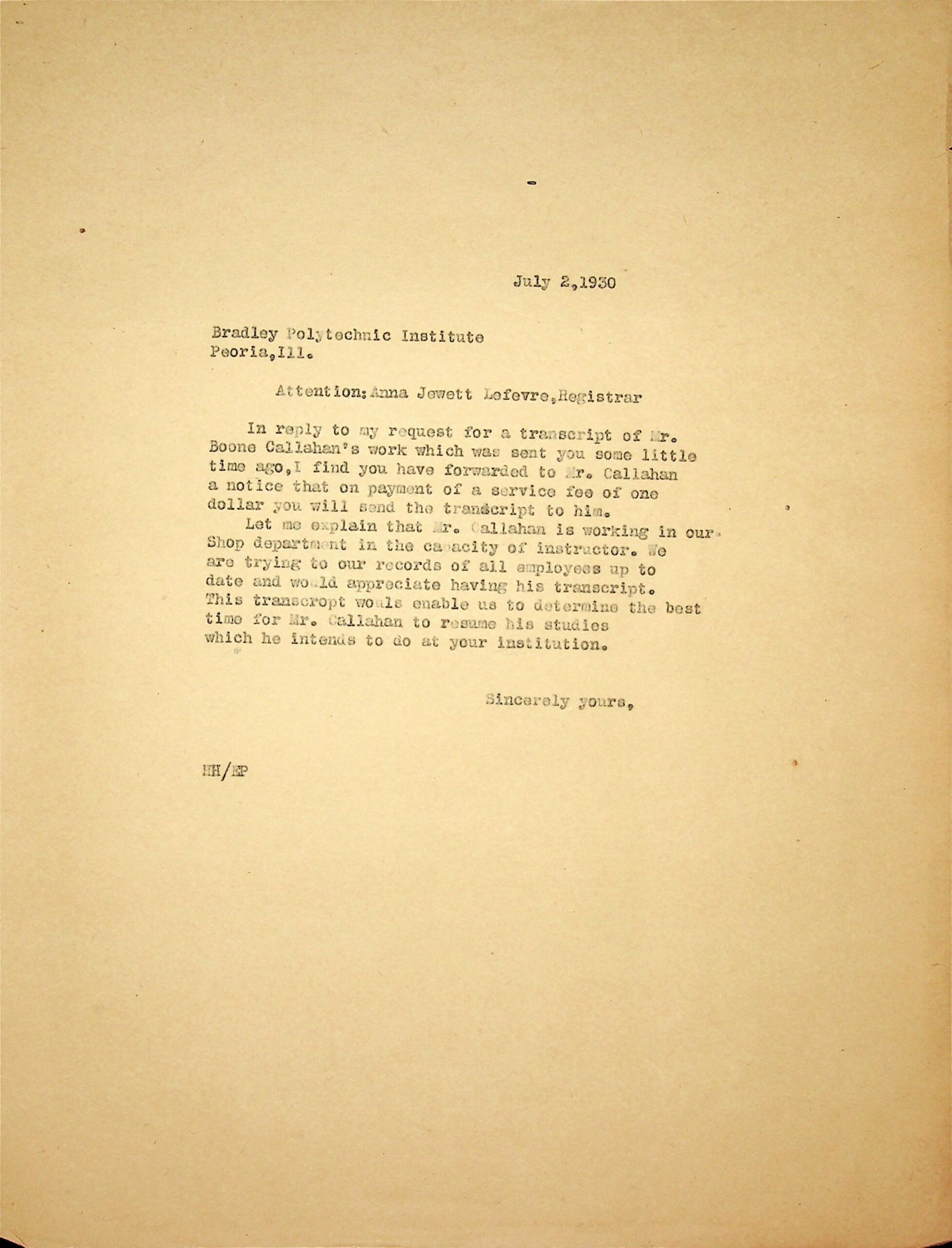(83) July 2, 1930. To Anna Jewett Lefevre, Registrar, Bradley Polytechnic Institute, Peoria, IL from HH [Hubert Hadley, PMSS Director]. Concerning the service fee sent to Callahan of $1 which the registrar requests for the transcript, HH explains that it is needed for PMSS’s employee files for Callahan.